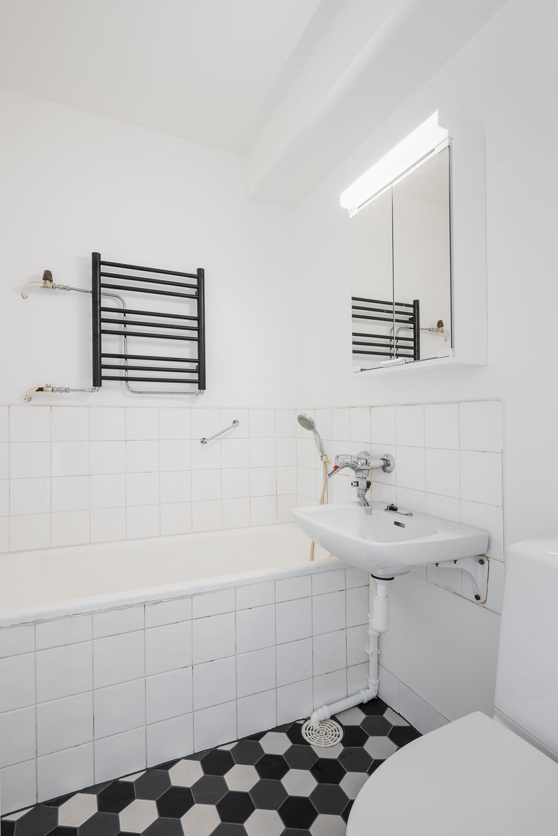 Vaalean sävyinen kylpyhuone, varusteina kylpyamme, vesikiertoinen pyyhekuivain, allas, peilikaappi ja wc-istuin. Lattia laattaa, seinät osittain laatoitettu. |