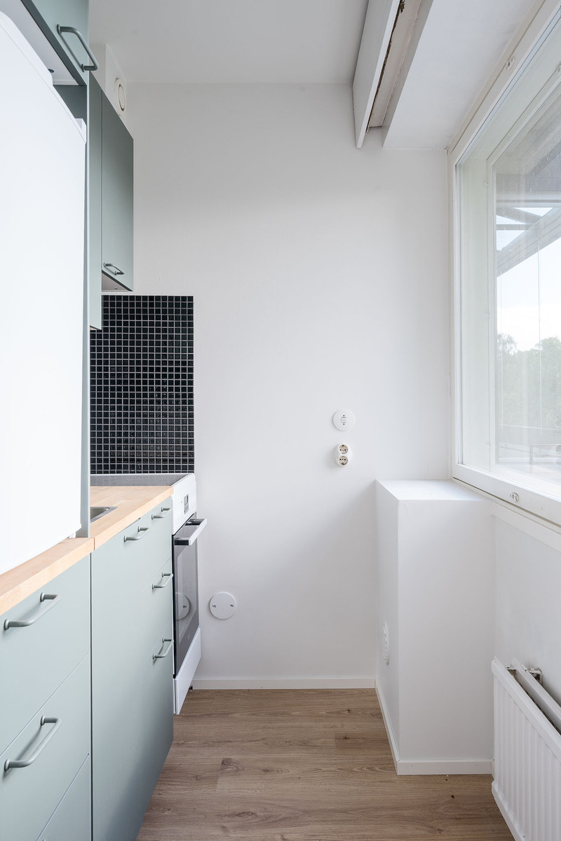 Toimiva salvian värinen pikkukeittiö, varusteina keraaminen liesi/uuni, jääkaappi pakastelokerolla, allas ja hana. Välitila laattaa, taso laminaattia. |