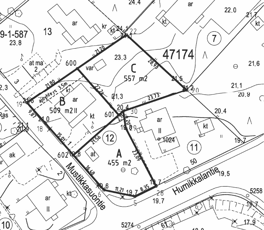 Hallinnanjakosopimuksen mukainen alue A, 455 m² määräosa, jolla rakennusoikeutta 110m² + 24m² taloustila / autotalli. Alueelle saa rakentaa maanalaisen kellarin sokkeli-ikkunoilla ja kaksi kerrosta maan päälle korkeintaan 7,5m korkeudella.