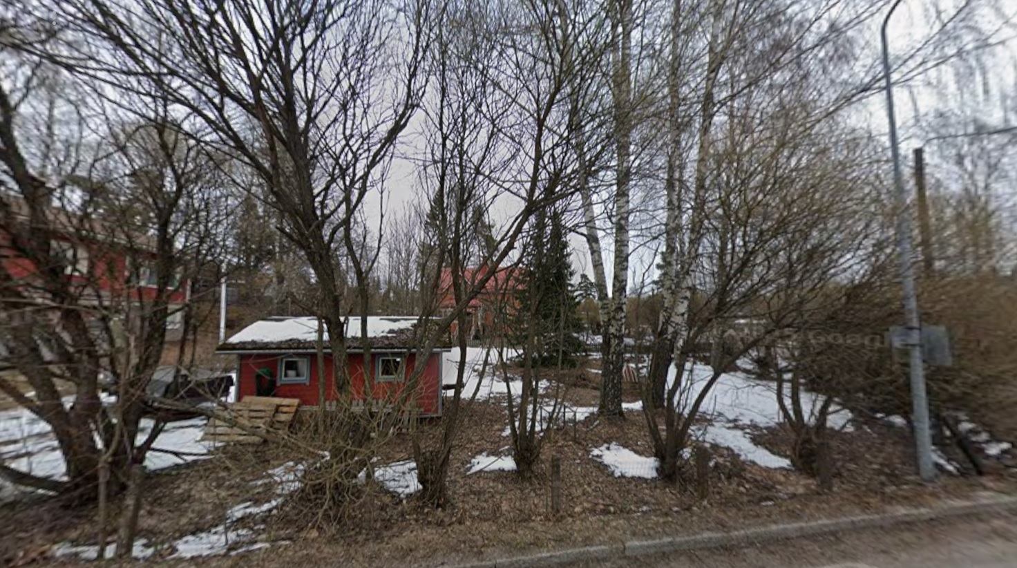 Alueella on tällä hetkellä käyttökuntoinen varastorakennus, muutama puu ja vanha kaivo.