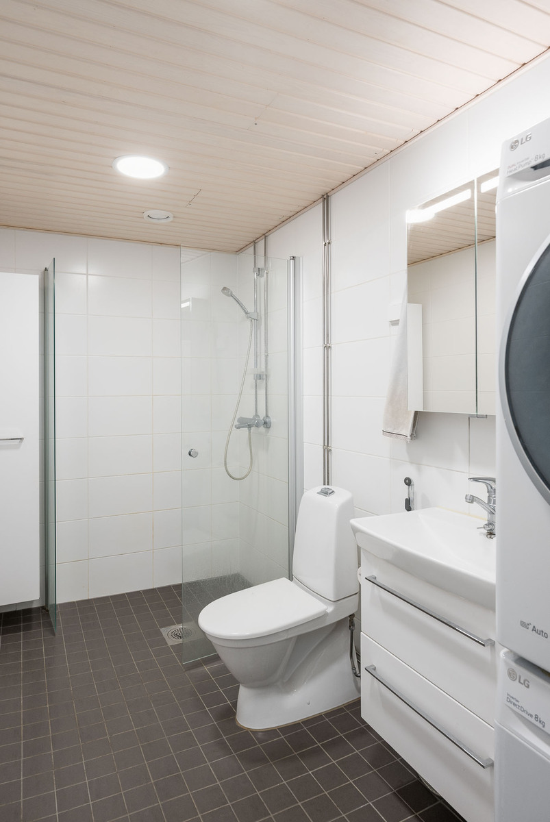 Vaaleansävyinen kylpyhuone, varusteina wc-istuin, suihku, allaskaappi, peilikaappi, pyykinpesukone ja kuivausrumpu. Säilytystilaa. Seinät laatoitettu valkoiset. Lattia laatoitettu harmaa. Lattialämmitys. |