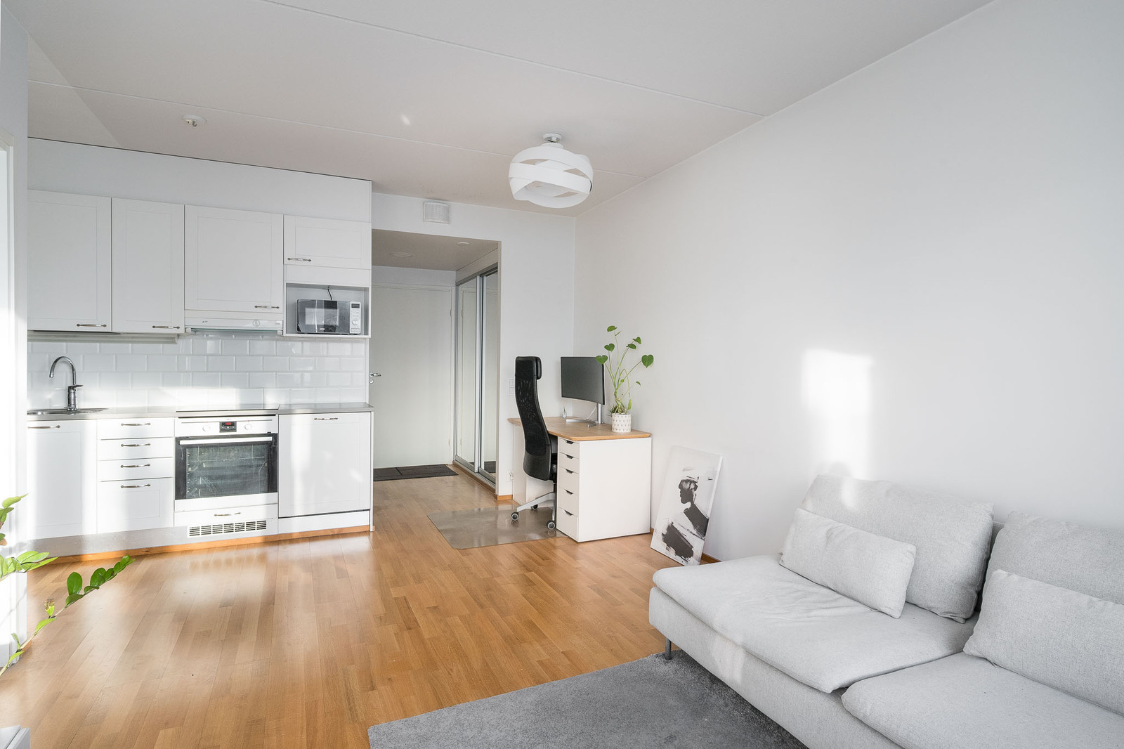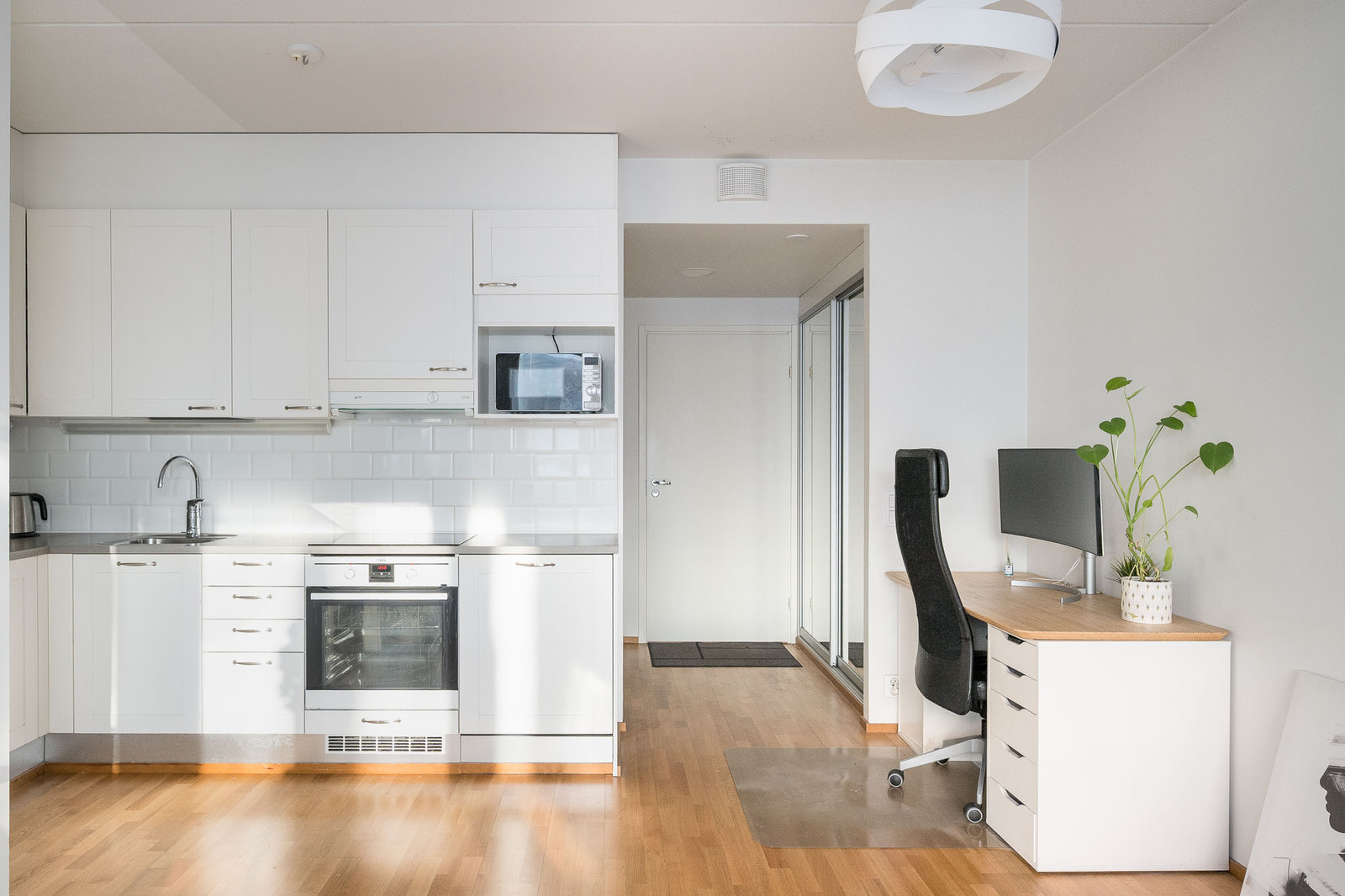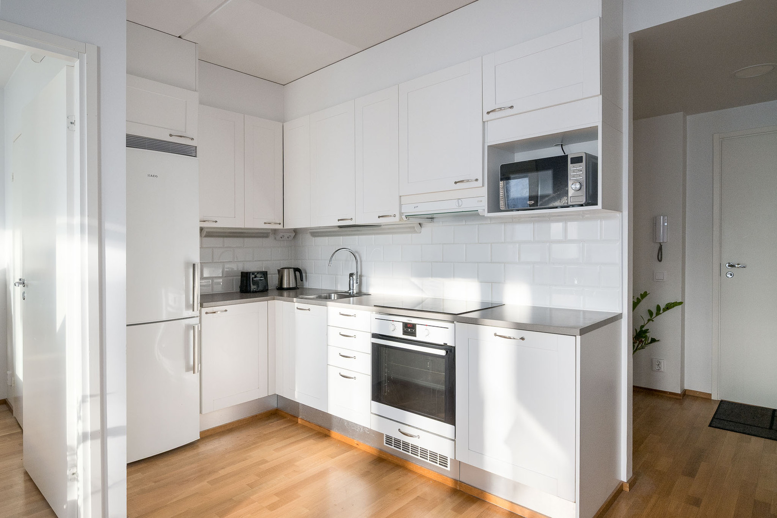 Valkoinen keittiö, varusteina jääkaappi/pakastin, integroitu astianpesukone, induktioliesi ja mikroaaltouuni. Tasot laminaattia. Välitila laatoitettu. |