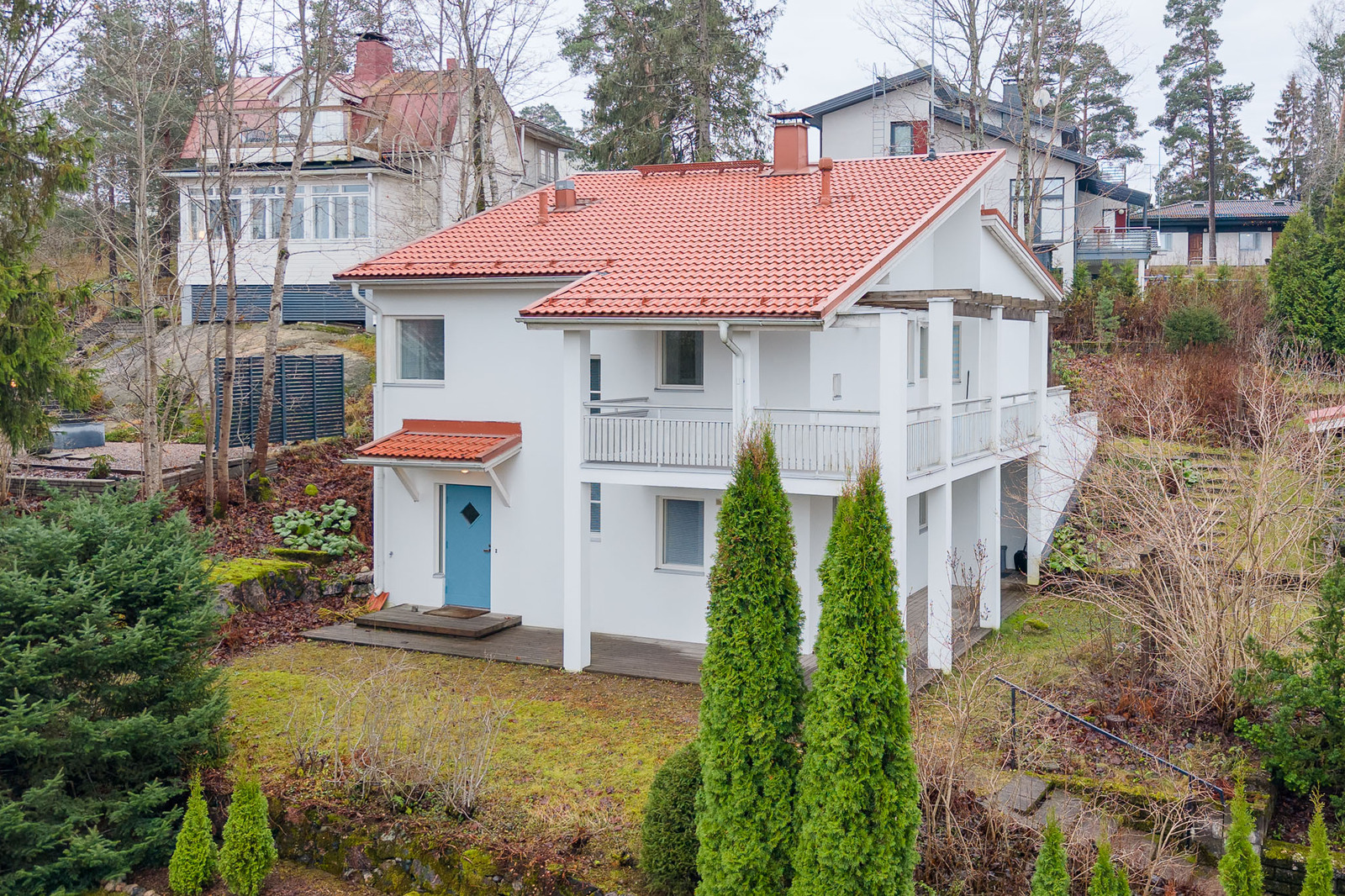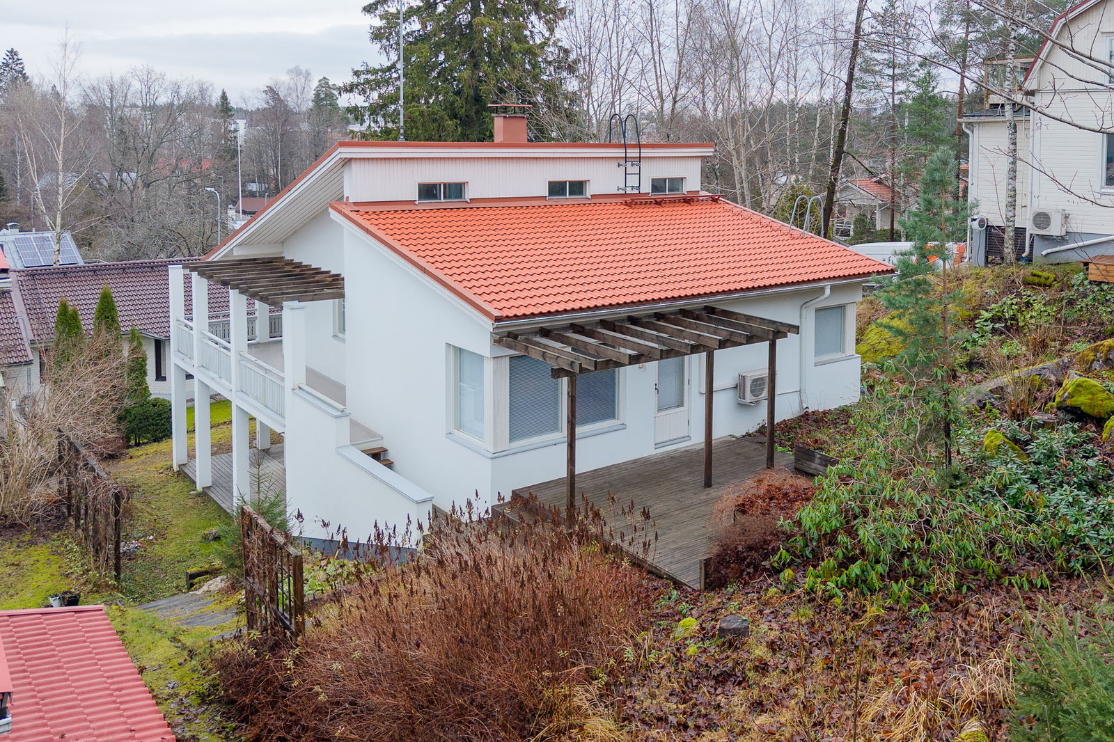 | Tehdyt korjaukset: | 2015 Katto tiilet vaihdettu, ruosteet korjattu, lämpöeristeet tarkastettu ja huippuimuri vaihdettu 2020 Julkisivun vanhojen rappausten poisto ja uusi rappaus 2022 Parvekkeen lattian pinnoitus akryylimassalla 2022 Katon mekaaninen harjaus ja myrkytys 2023 Yläkerran ilmalämpöpumpun asennus 2024 Alapihan terassin huolto ja pinnoitus, parvekkeen kaiteiden huolto ja pinnoitus |