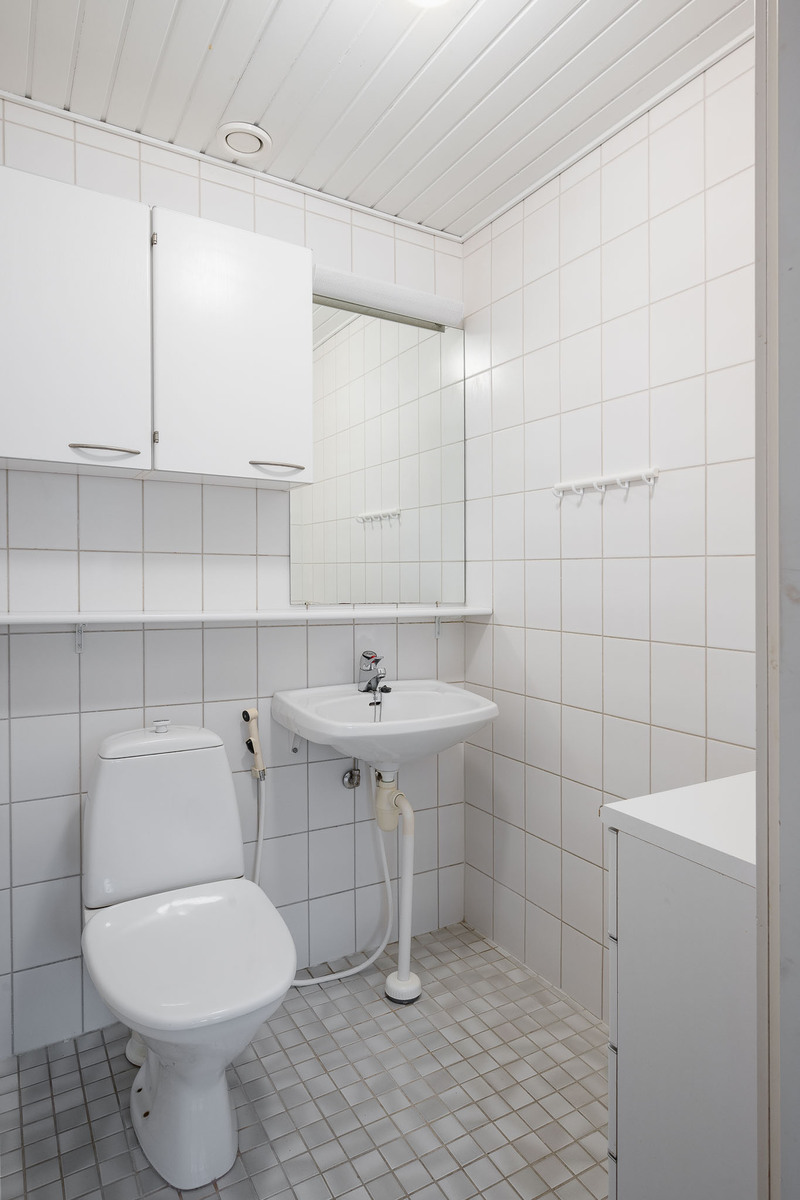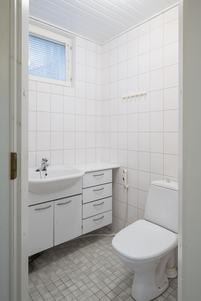 2 erillistä WC:tä. Alakerrassa lattia laattaa, seinät kaakelia, bidee, allaskaapisto, peili. Yläkerrassa bidee, pesuallas,peili ja kaappi. |
