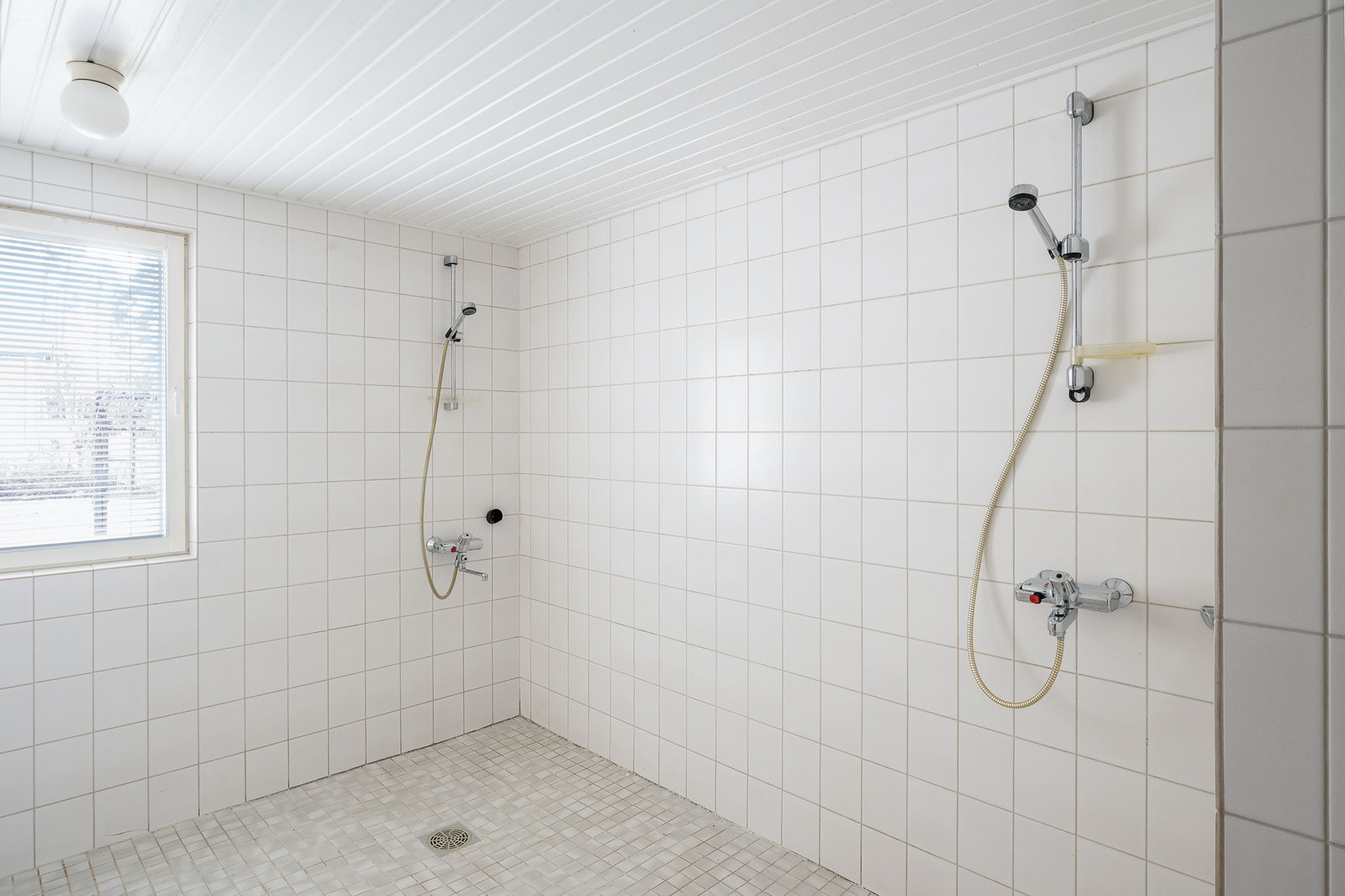 Alakerrassa iso kylpyhuone kahdella suihkulla, saunaosaston yhteydessä. Lattia laattaa, seinät kaakeloitu, kaksi suihkua. Tila vaatii täyden remontin. |