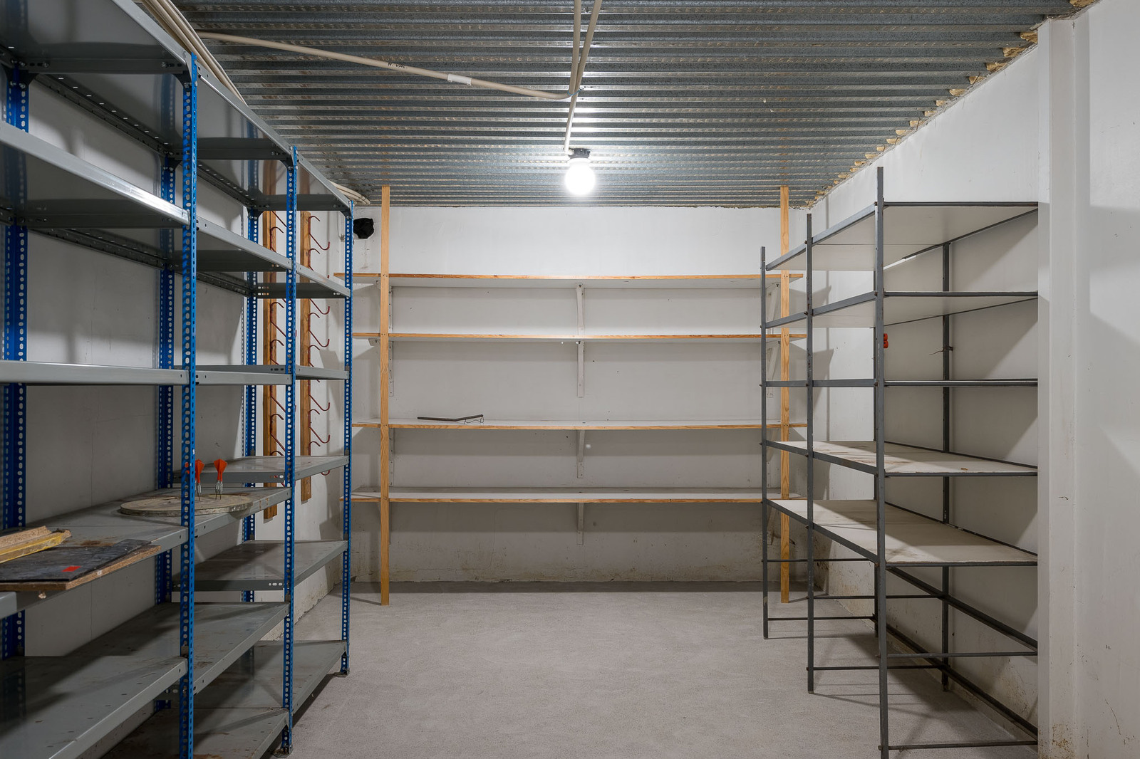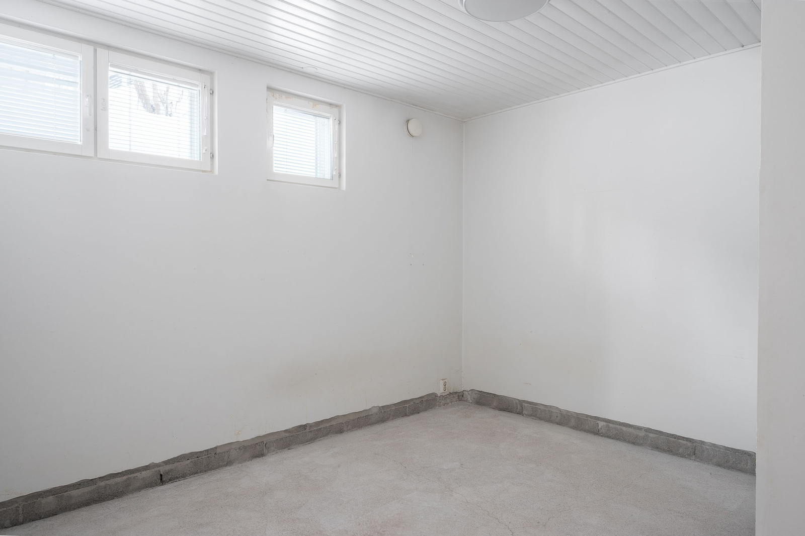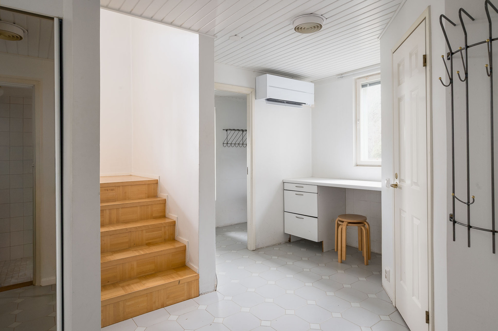 Alhaalla kodinhoitotila, lattia laattaa seinät maalattu, pesukoneliitäntä. |