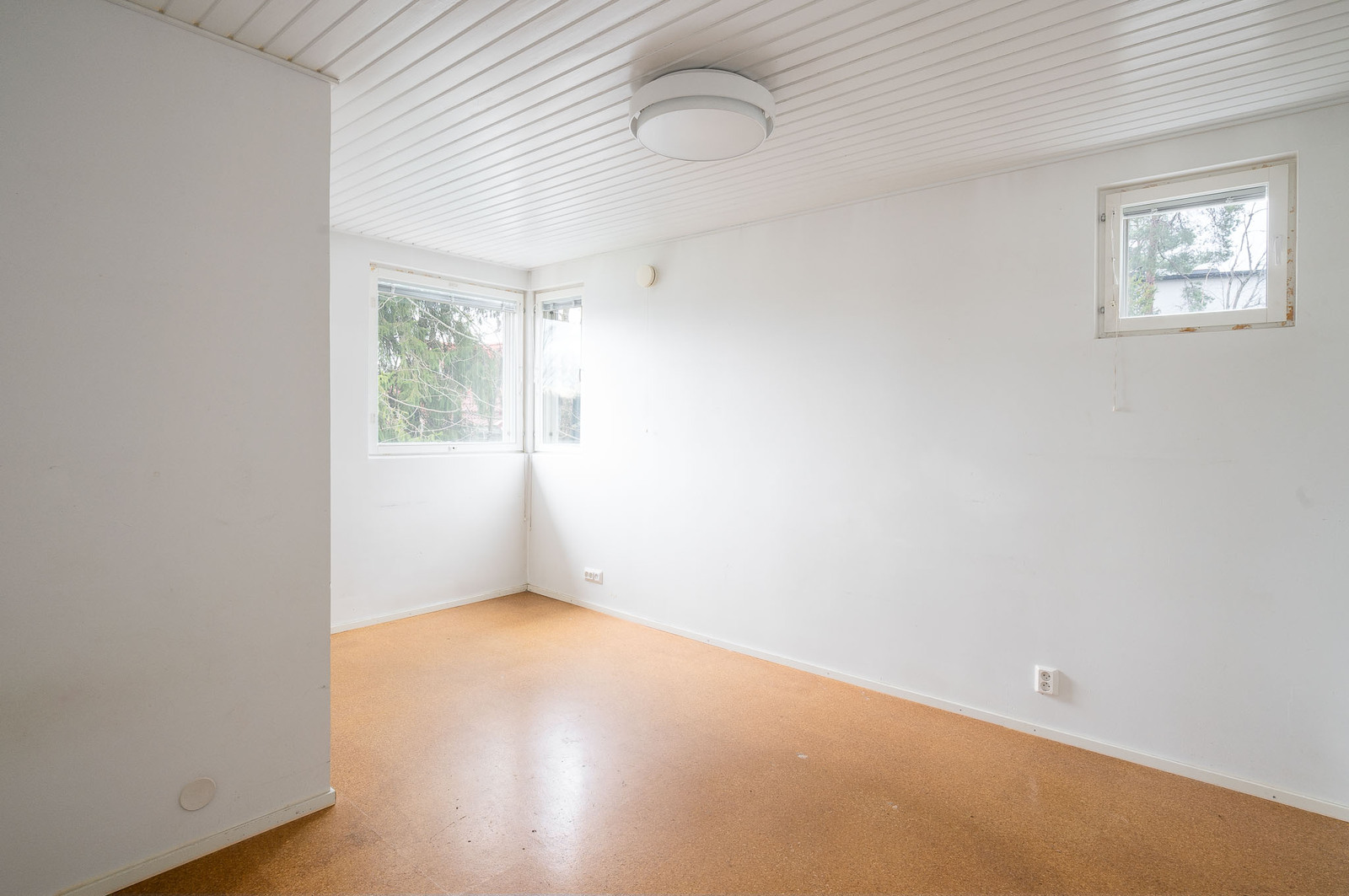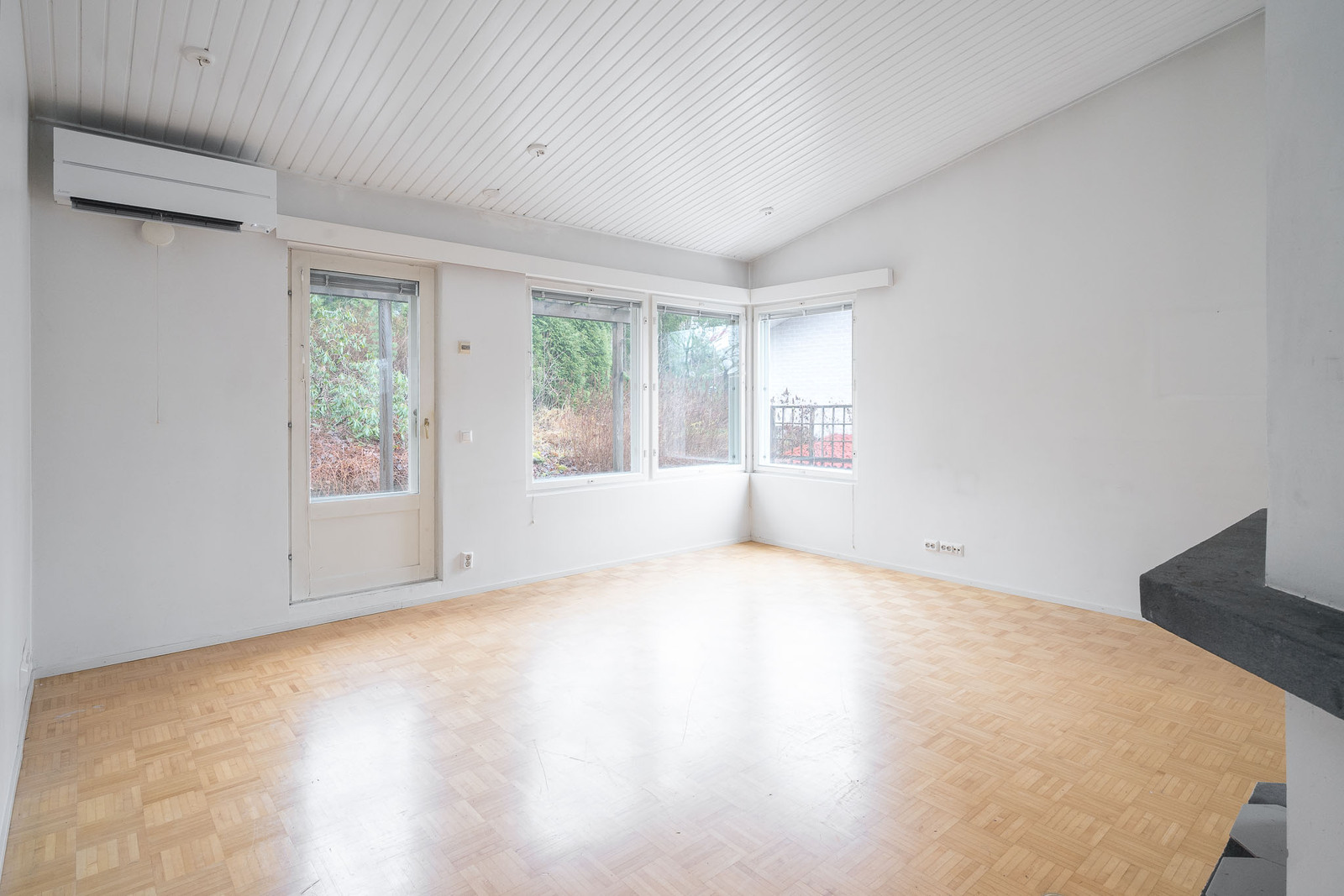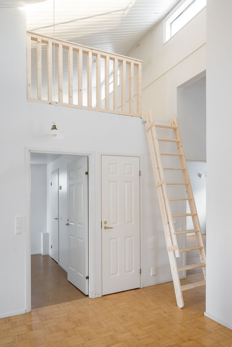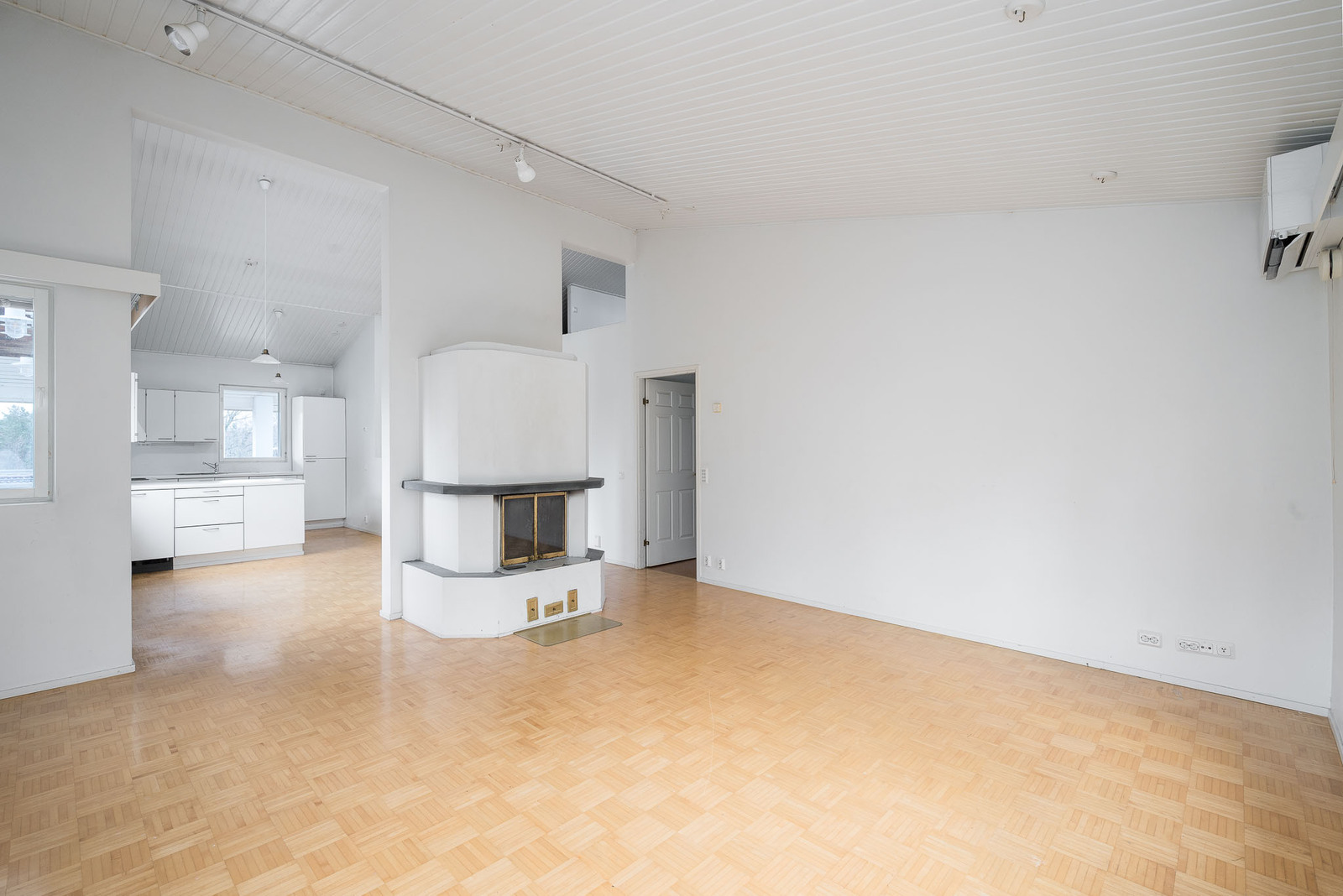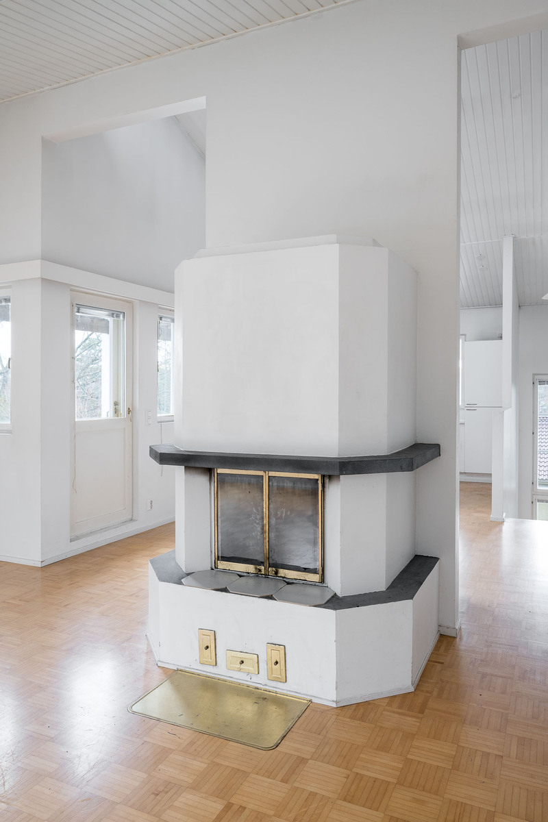 Yläkerrassa iso valoisa olohuone, josta käynti patiolle ja pihalle. Olohuoneessa takka, ilmalämpöpumppu ja runsaasti ikkunapintaa, lattia parkettia ja seinät maalattu. |