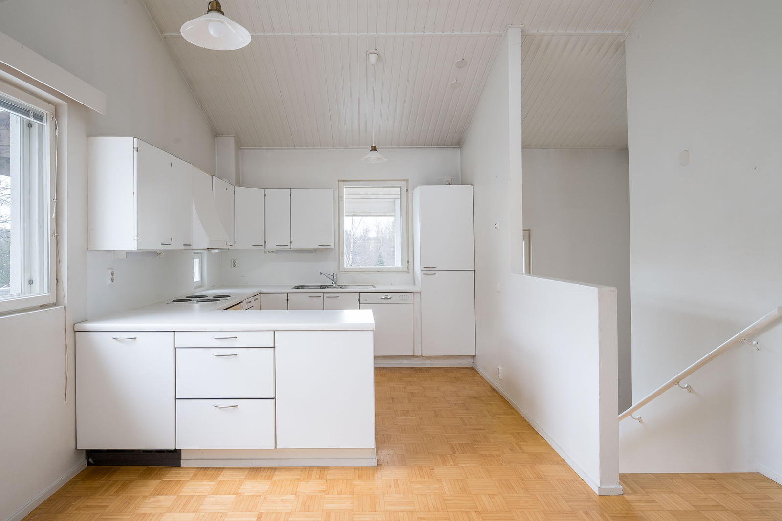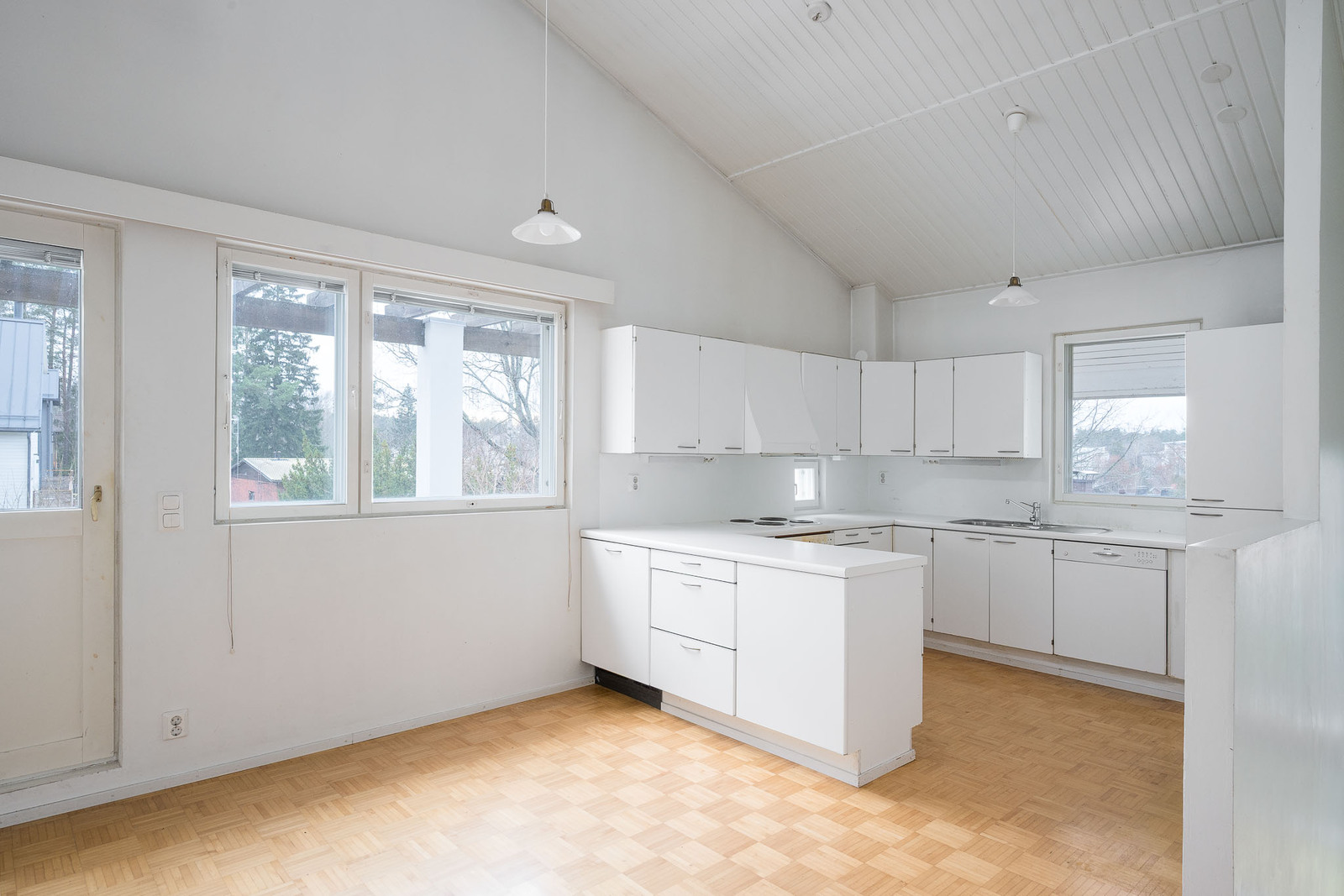 Vaalea remontin tarpeessa oleva tilava avokeittiö, jossa kaksi ikkunaa, lattia parkettia seinät maalattu. Kodinkoneet vaativat uusimista. Keittiöstä käynti terassiparvekkeelle. |