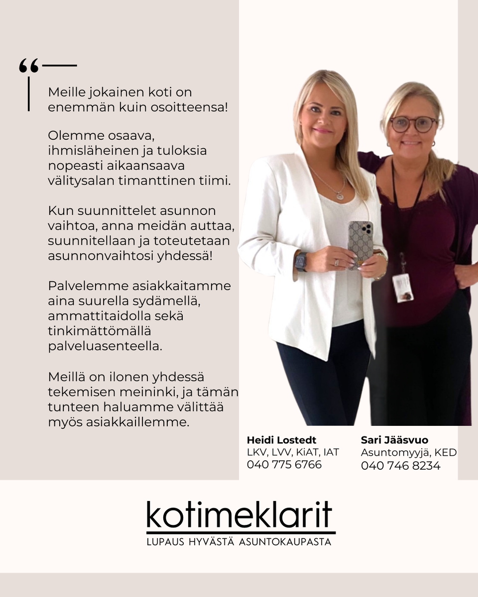 Tässä on monien mahdollisuuksien koti hyvällä pohjaratkaisulla! Espoon Kilossa rauhallisella pientaloalueella asunto-osakeyhtiössä sijaitseva tilava erillistalo, tarjoaa erinomaiset puitteet isollekin perheelle. Tässä kaksikerroksisessa talossa on 5 huonetta, avokeittiö, saunaosasto, kodinhoitotila ja runsaasti varastotilaa. Yläkerran asuintilat ovat avarat ja valoisat. Kaksi makuuhuonetta, joiden välissä on vaatehuone, iso olohuone, jossa varaava vaalea takka sekä ilmalämpöpumppu tuomaan lämpöä ja viihtyisyyttä. Olohuoneesta käynti takapihan patiolle mistä näkymät kauniille pihatörmälle. Avokeittiössä on viistokatto, jonka ansiosta huonekorkeus tuo lisää tilantuntua jo ennestään isoon tilaan, kaksi ikkunaa ja ovi mistä käynti talon kulmaa kiertävälle parvekkeelle. Erillinen wc ja lisänä persoonallinen ikkunallinen parvitila. Alakerrassa sisään tultaessa käytännöllinen kuraeteinen vesipisteellä, joka on kiva lisä lapsiperheille ja lemmikeille. Eteisestä käynti kodinhoitotilaan. Alakerrassa on runsaasti säilytystilaa, 1 makuuhuone, askarteluhuone, varastohuone, saunaosasto, suihkuhuone kahdella suihkulla ja erillinen wc. Uusimalla keittiön, kylpytilat ja pienellä pintaremontilla teet tästä kodista toimivan ja viihtyisän kokonaisuuden. Kohde on kuntotarkastettu. Tervetuloa ihastumaan! Lisätietoja ja esittelyvaraukset: Sari Jääsvuo KED 040 746 8234 sari@kotimeklarit.com Heidi Lostedt LKV, Kiat, IAT 040 775 6766 heidi@kotimeklarit.com Tervetuloa seuraamaan meitä Instagramissa @lkvheidilostedt_sarijaasvuo