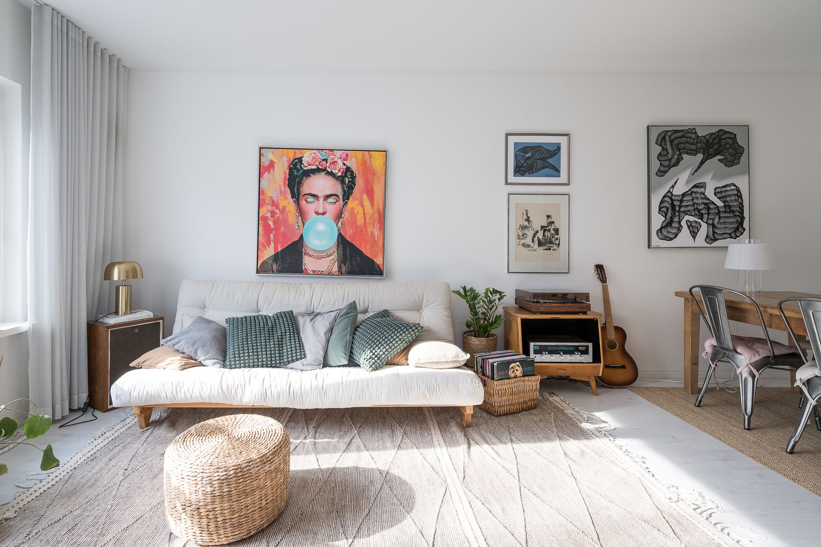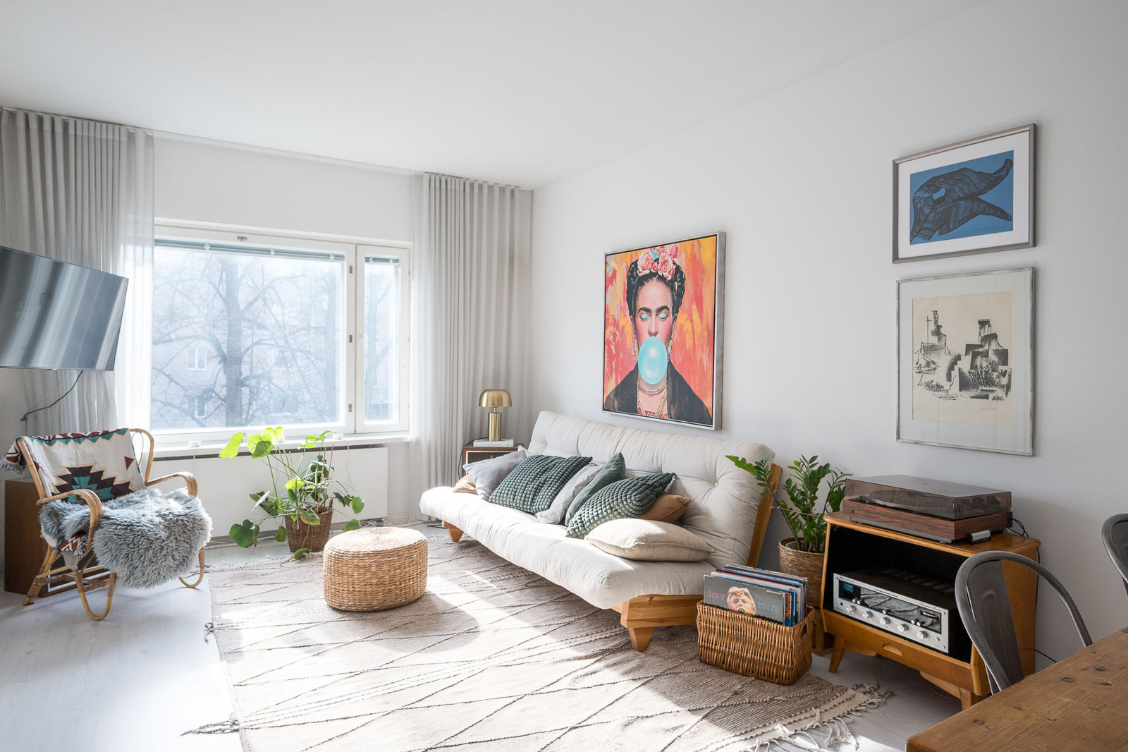 Olohuoneesta kaunis näkymä avaralle puistomaiselle pihalle. Lattia laminaattia, seinät maalattuja. Olohuoneessa on hyvin tilaa isollekin ruokapöydälle. |