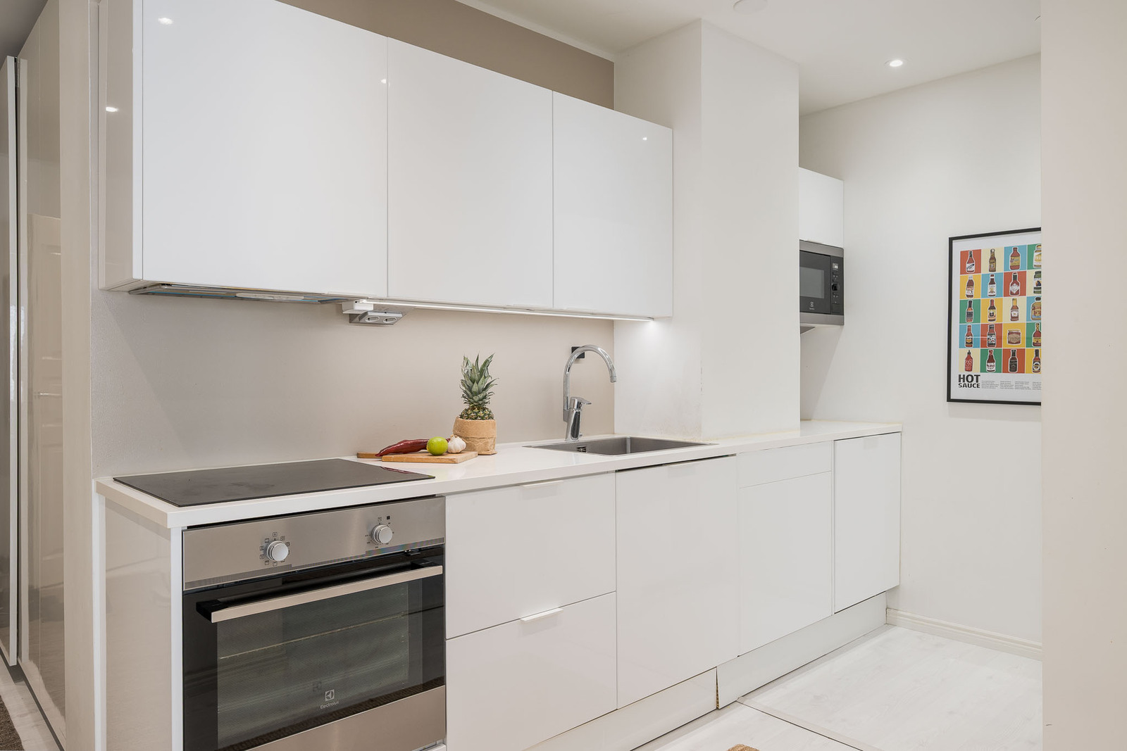 Keittiössä on valkoiset keittiökaapistot. Kodinkoneet: Jääkaappi/pakastin, induktioliesi, erillisuuni, liesituuletin, astianpesukone ja mikro. Lattia on laattaa ja seinät ovat maalattuja. |