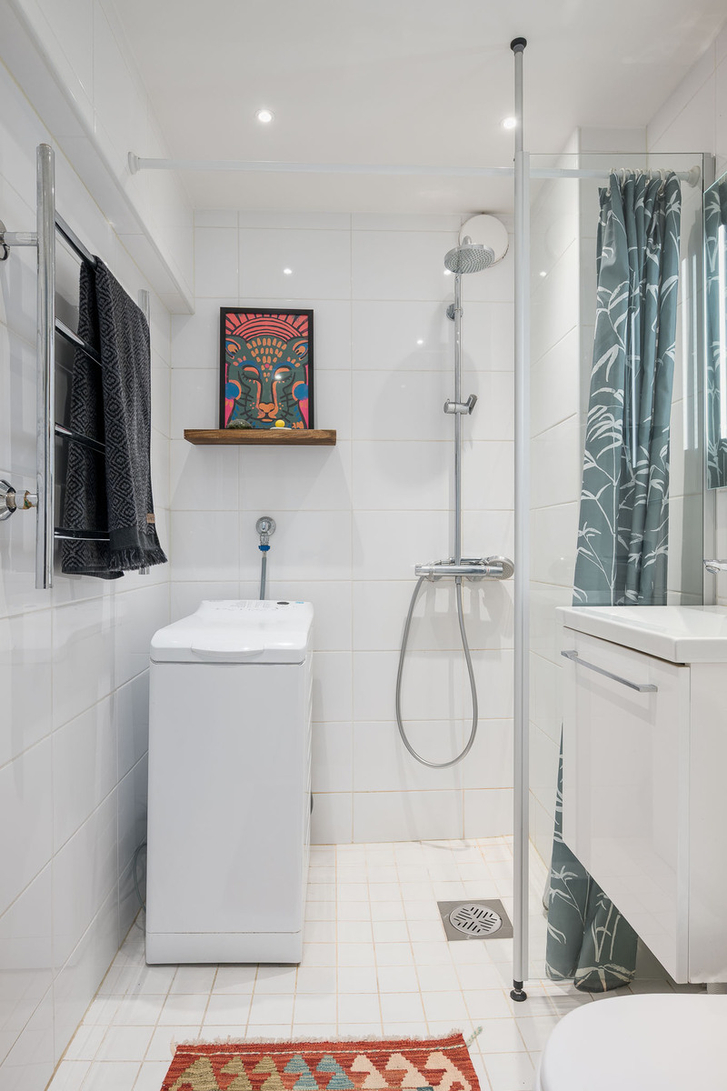 Kylpyhuoneessa suihku, suihkuseinä, allaskaappi, peili, wc-istuin. Pesukoneliitäntä. Lattia laattaa, seinät kaakelia. |