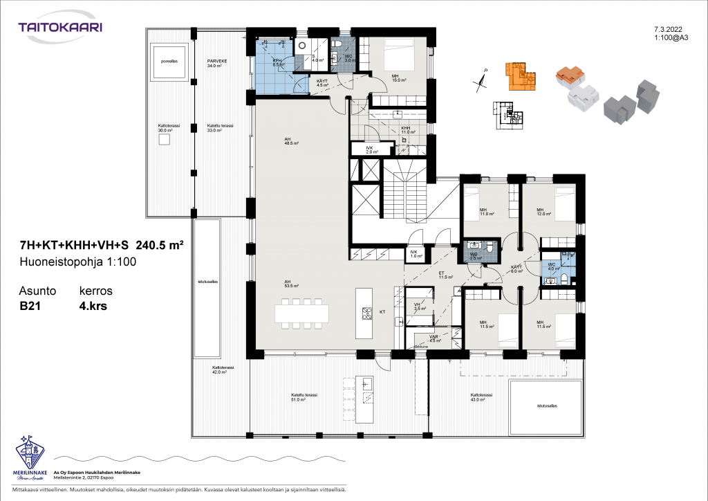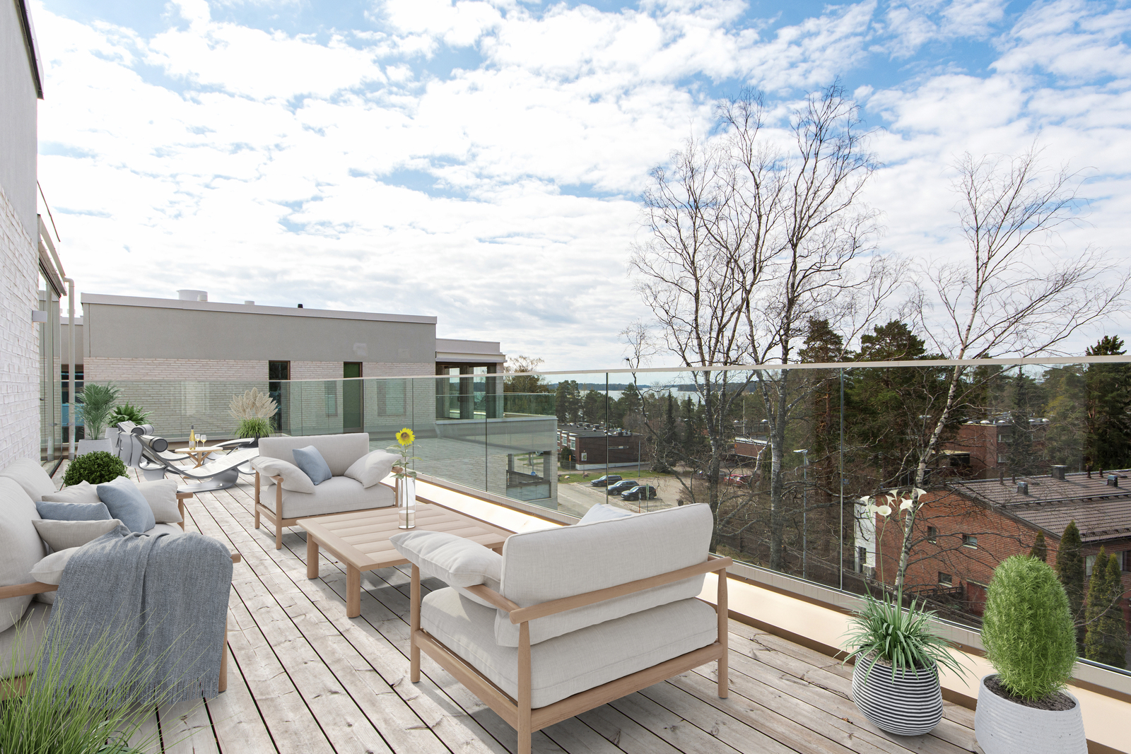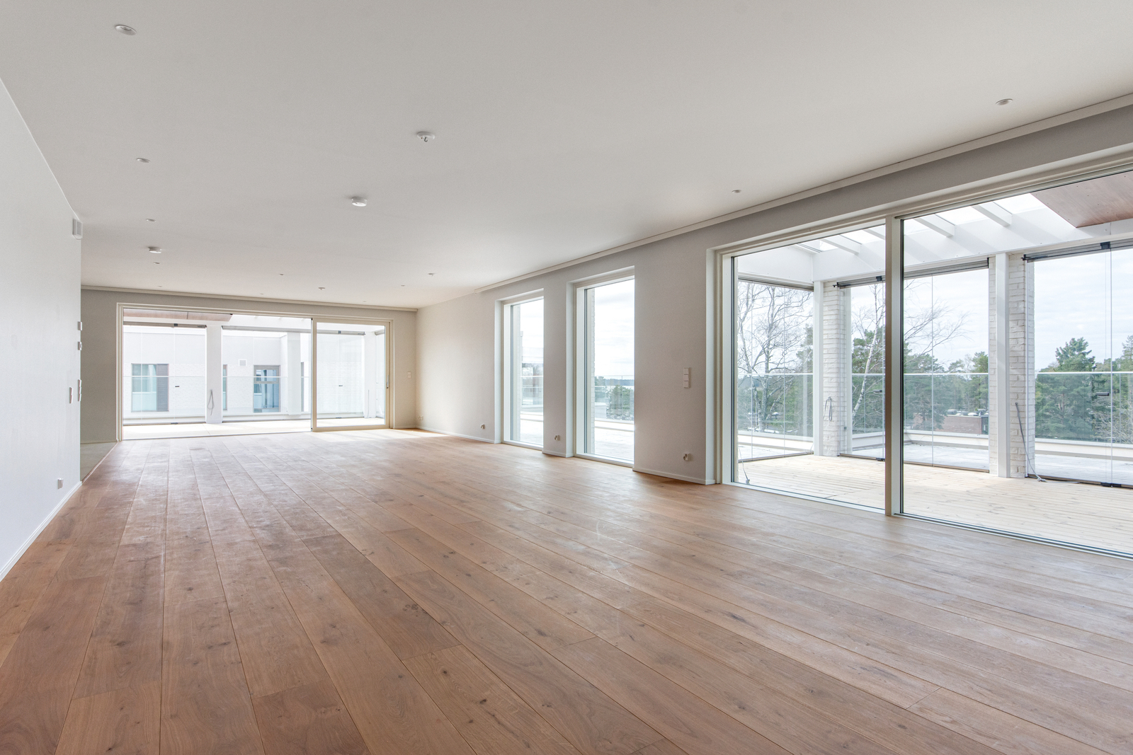 ESPOON HIENOIN PENTHOUSE MERINÄKYMIN! Haukilahdessa meren äärellä luksusluokan asumista huikean kauniissa kattohuoneistossa. Tämä koko ylimmän asuinkerroksen käsittävä merellinen arvohuoneisto on poikkeuksellisen laadukas kokonaisuus. Materiaalivalointoihin, huonejärjestelyyn sekä asumismukavuuteen on kiinnitetty erityistä huomiota. Tämä suurellekin perheelle soveltuvassa huoneistossa ei ole seinänaapureita ja se on hyvin muuntelukelpoinen. Huoneistossa on viisi makuuhuonetta, joista kahdesta on käynti kattoterassille. Suurin makuuhuoneista, masterbedroom, sijoittuu omaan rauhaansa huoneiston toiseen päätyyn, muut neljä makuuhuonetta sijoittuvat huoneiston toiseen päähän. Pesuhuoneet, saunatilat sekä laadukkaat ja tilavat kodinhoitotilat vastaavat vaativampiakin toiveita. Myös saunaosastolta on käynti huoneistoa kiertävälle 200 m2 kattoterassille, josta osa on lasitettu ja katettu. Terassilta on huikean kauniit näkymät merelle ja puistoalueella. Terassilla on varaukset kesäkeittiölle sekä porealtaalle. Asunto Oy Haukilahden Merilinnake on v. 2023 valmistunut omalla tontillaan sijaitseva kahden talon yhtiö. Yhtiön on suunnitellut arkkitehtitoimisto Konkret Oy ja talojen suunnittelussa ja rakentamisessa on kiinnitetty erityistä huomiota asumismukavuuteen, hyvään materiaali- ja varustelutasoon sekä asumisen huolettomuuteen. Huoneistoissa on vesikiertoinen lattialämmitys ja -viilennys, lämmitysmuotona on maalämpö, hoitovastike on vain 4,20 €/kk. Kulku huoneistoon on esteetön ja autohalliin on kulku suoraan hissillä. Huoneisto on heti vapaa! Kysy lisätietoja ja sovi oma esittelyaikasi välittäjältä Nina Asteljoki p. 0400 444 220 tai nina@kotimeklarit.com