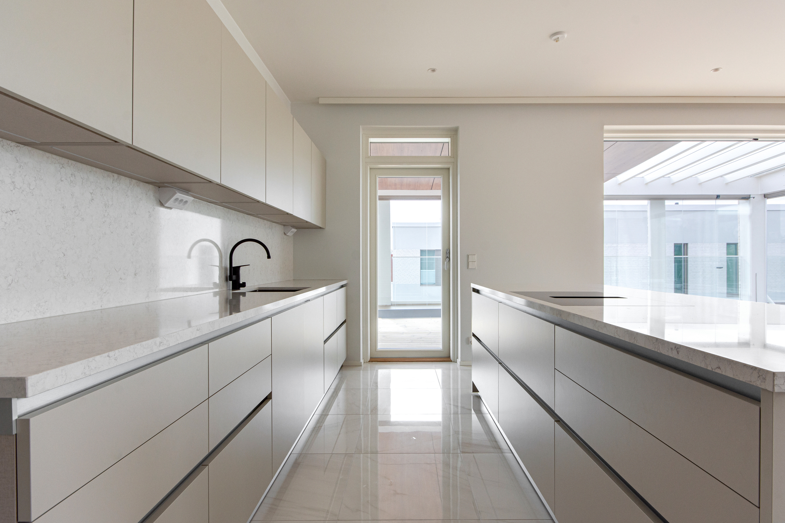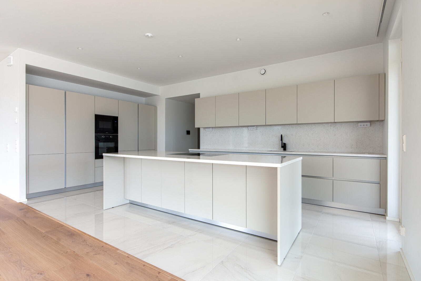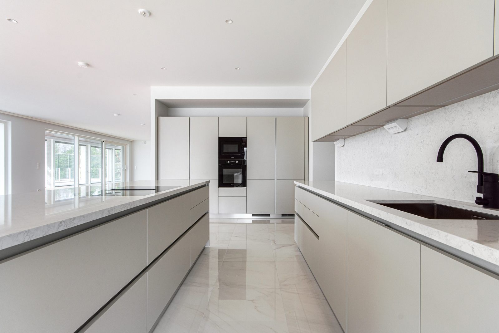 Scavolinin kaunis avokeittiö. Vaaleat kivitasot ja välitila yhdistettynä hiekan värisiin kaapistoihin luovat tyylikkään kokonaisuuden. Suureen saarekkeeseen on upotettu induktioliesitaso. Keittiöstä löytyy integroituna myös kaksi jääkaappi/pakastinta sekä astianpesukone. Kalusteuuni ja mikroaaltouuni on sijoitettu ergonomisesti työskentelykorkeudelle. Kaikki kodinkoneet on Mielen. Keittiössä on vaalea 60x60 laattalattia. |