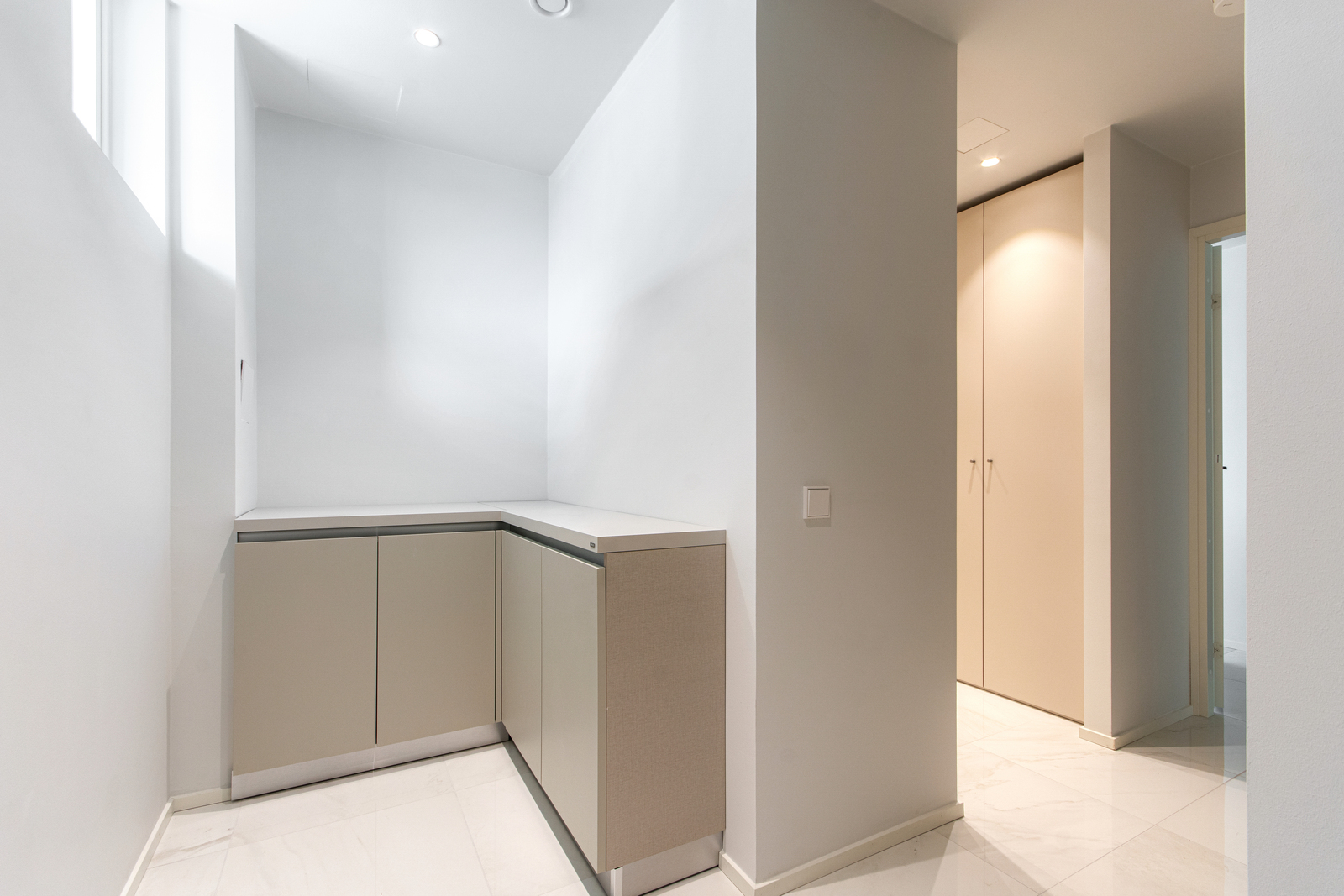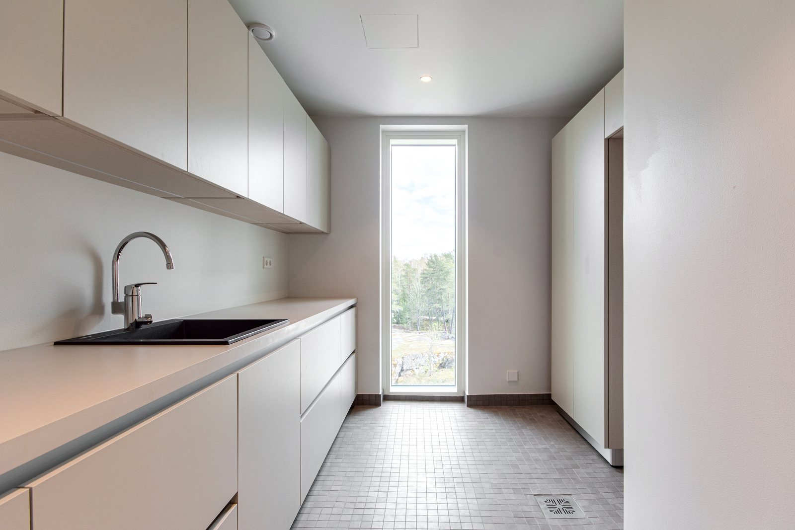 Masterbedroomin yhteydessä kodinhoitohuone, jossa reilusti kaapistoja sekä paikka pesutornille. |