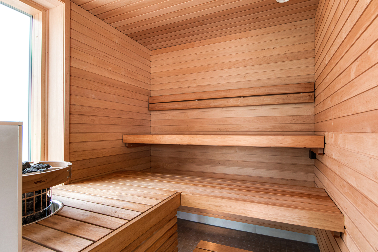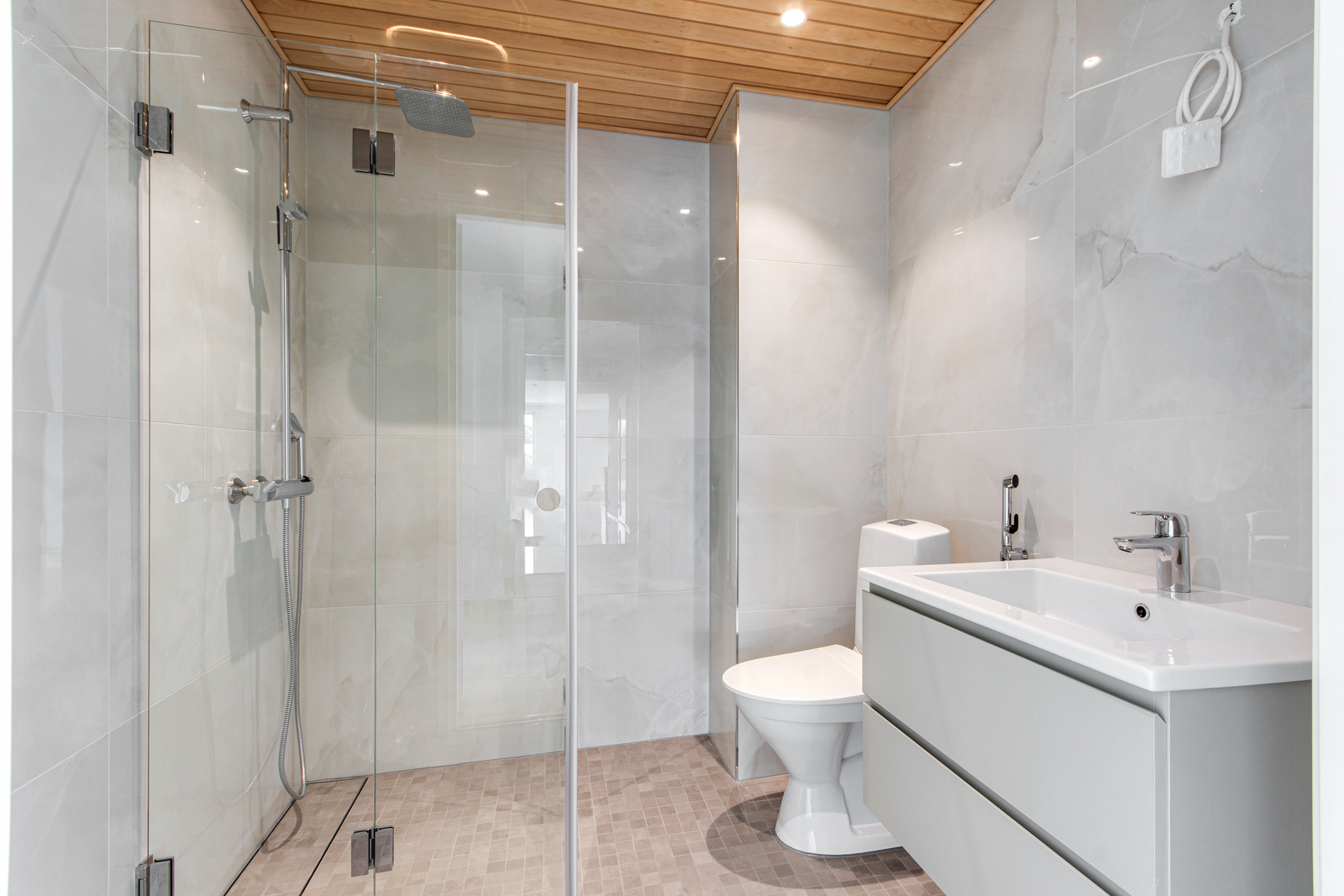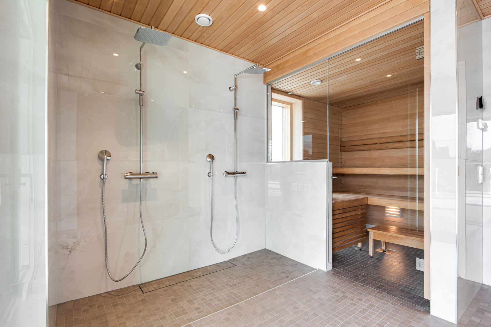 Masterbedroomin yhteydessä on erillinen wc ja kylpyhuone, jossa kaksi suihkua, sauna sekä kulku kattoterassille. Toisessa kylpyhuoneessa suihku, suihkuseinät, allaskaapisto, wc-istuin. Kaikissa huoneiston wc- ja kylpyhuonetiloissa on harmaat laattalattiat ja suuret vaaleat seinälaatat. |