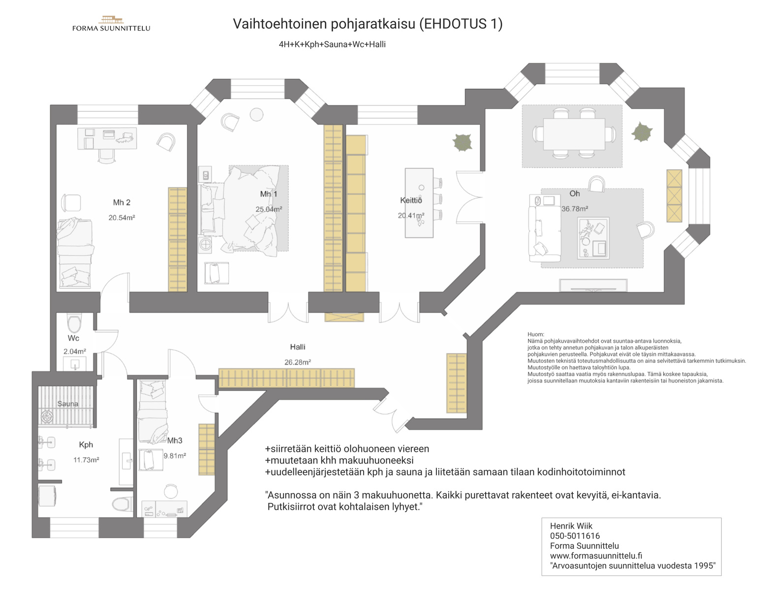 | Huoneluku: | 3h,k, muunneltava halli, sauna, kph, khh, erillinen wc |