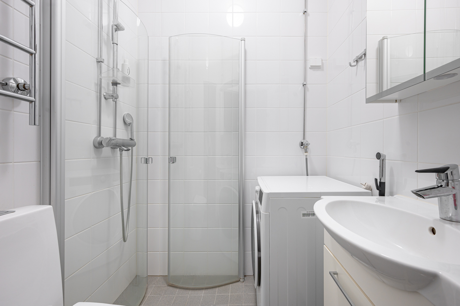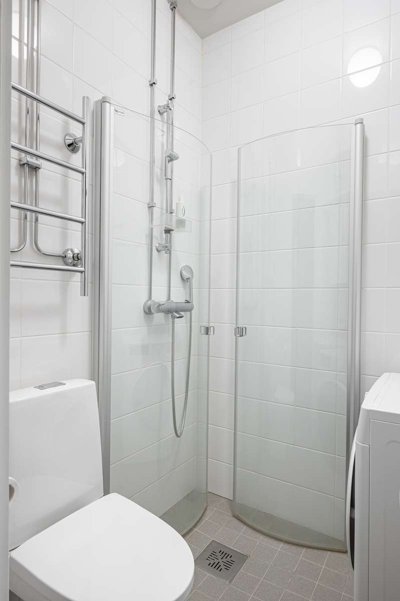 Vaalea ja ajaton kylpyhuone varusteina wc-istuin, allaskaappi, peilikaappi, suihku, suihkuseinä, pyyhekuivain. Lattia harmaata laattaa. Seinät valkoista laattaa. Mukavuuslämmitys. |