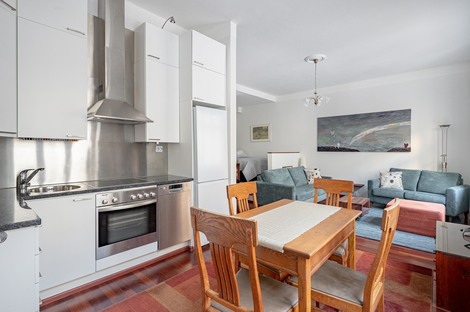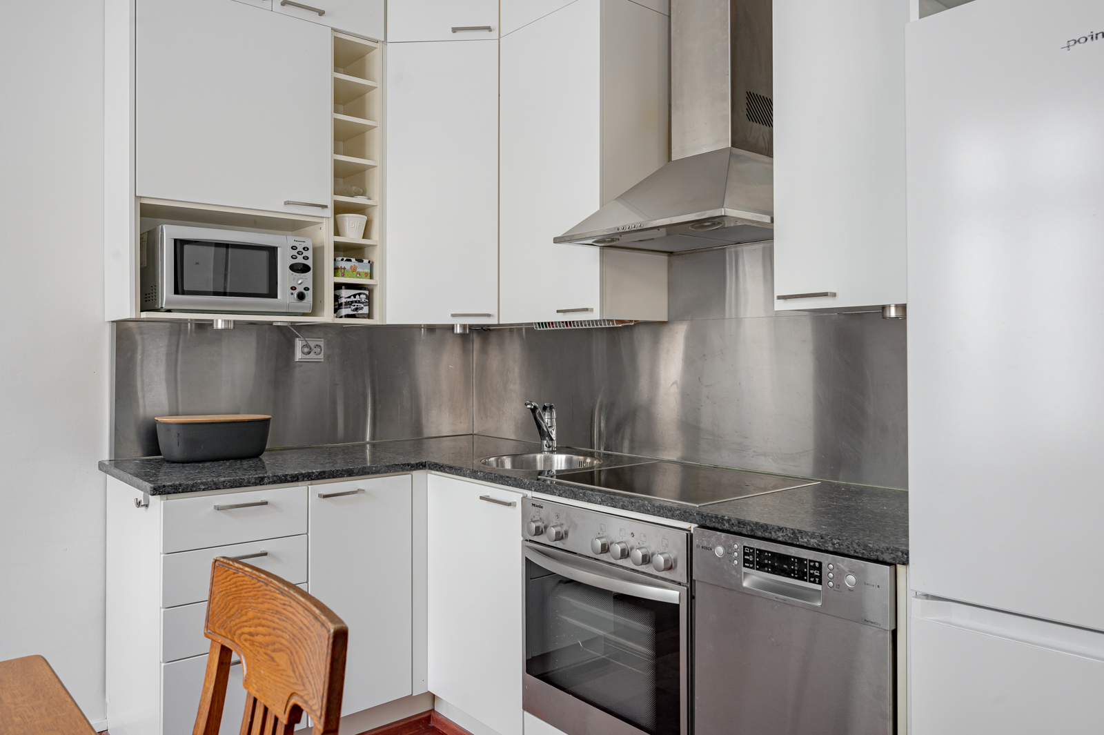Valkoinen avokeittiö varusteina jääkaappi/pakastin, erillisuuni ja tasoliesi, astianpesukone 45 cm, liesituuletin. Työtaso graniittia. Välitila ruostumatonta terästä. |