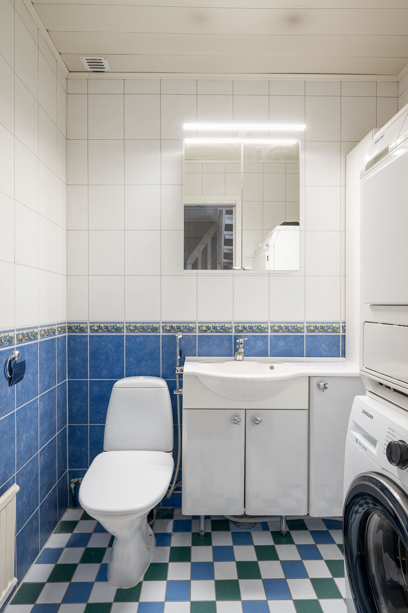 Alakerran wc:ssä: Peili-, allas- ja korkeakaappi, wc-istuin ja bidee, pesukoneliitäntä, patteri. Seinä- ja lattiapinnat kaakelia. |