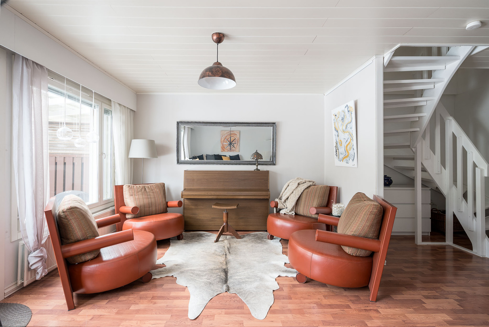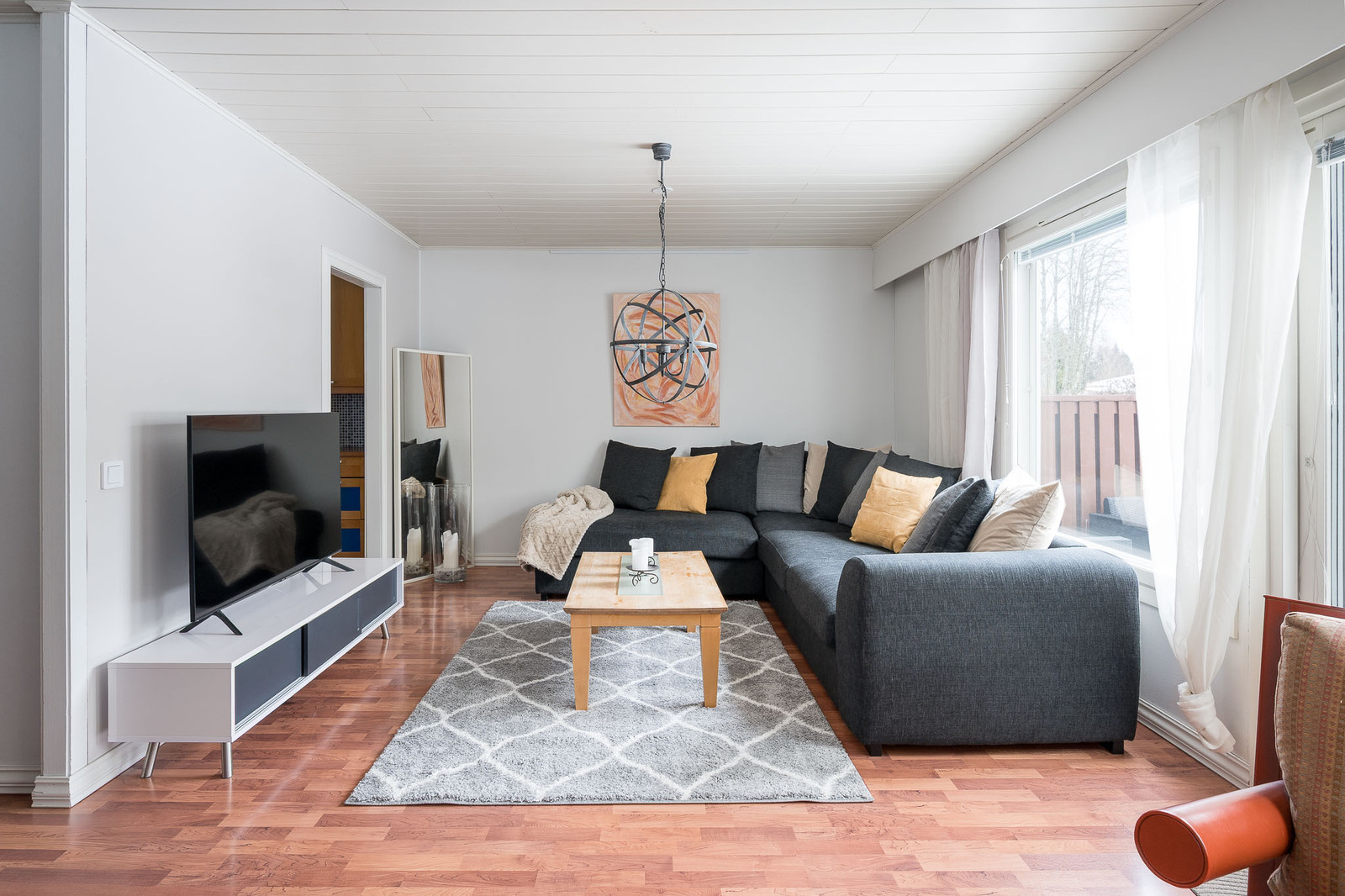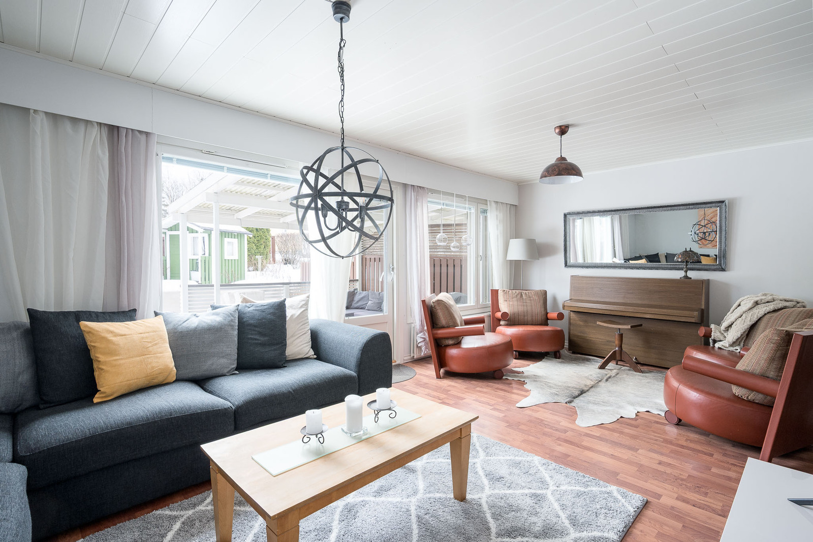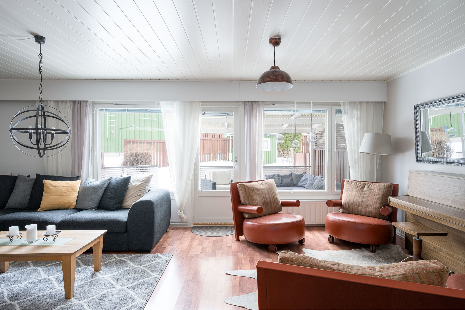 Olohuone on avara ja siitä on käynti katetulle terassille ja pihalle. Lattia on laminaattia ja seinät ovat maalattuja. |