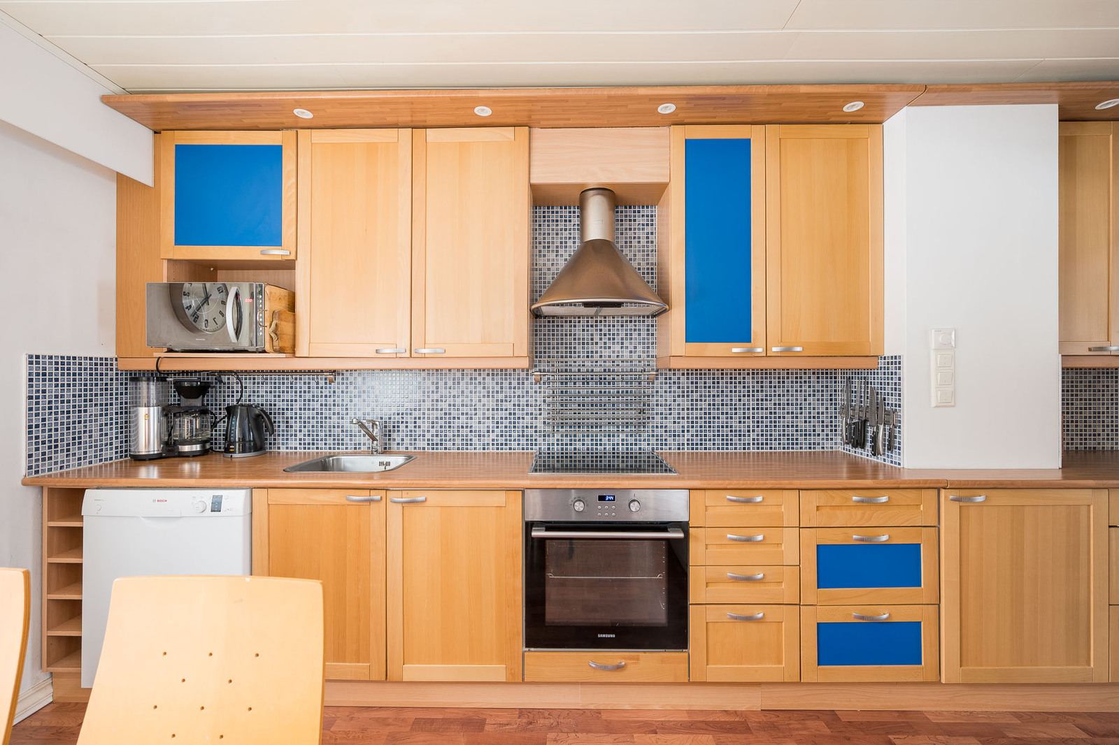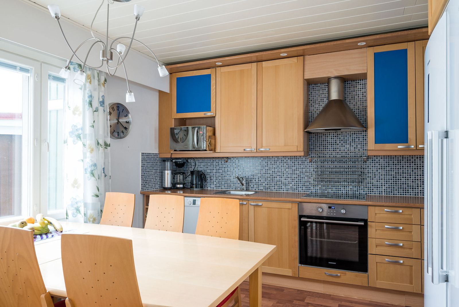 Tilavassa keittiössä on runsaasti kaapistoja ja laskutilaa. Keittiön varusteet: Jää- ja pakastinkaappi, induktioliesi, erillisuuni, liesituuletin ja astianpesukone. Työtaso on laminaattia ja välitila on laatoitettu. Keittiön lattia on laminaattia. Seinät on maalattu ja pesunkestävää tapettia. |