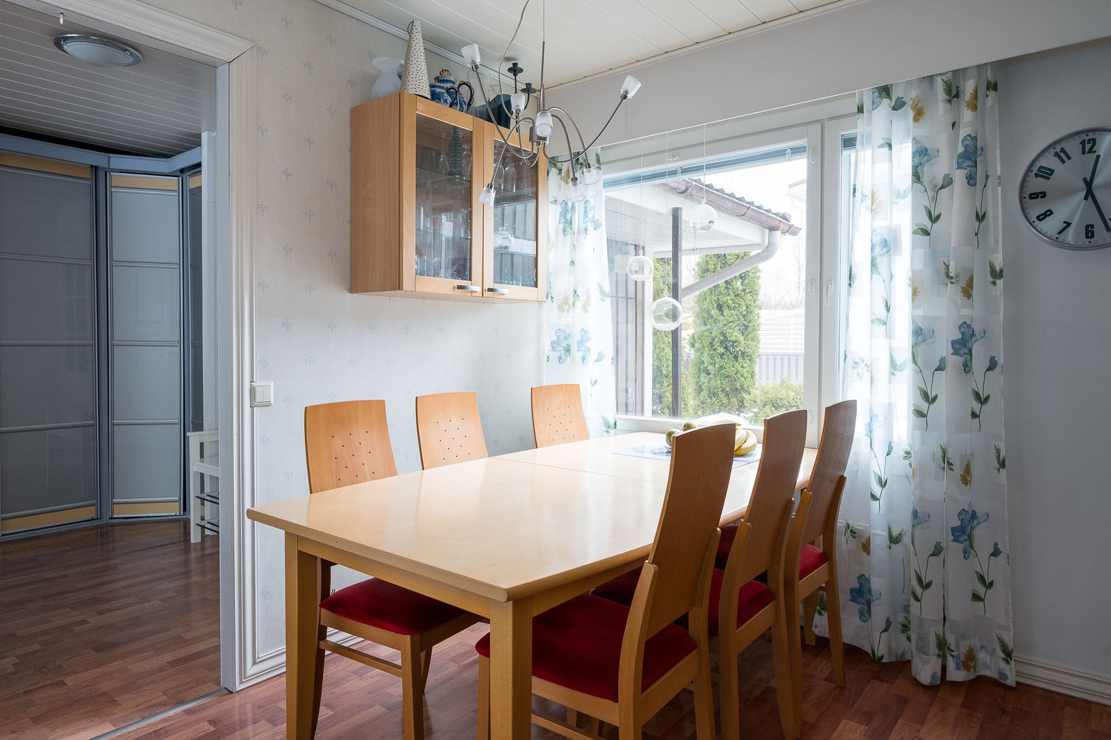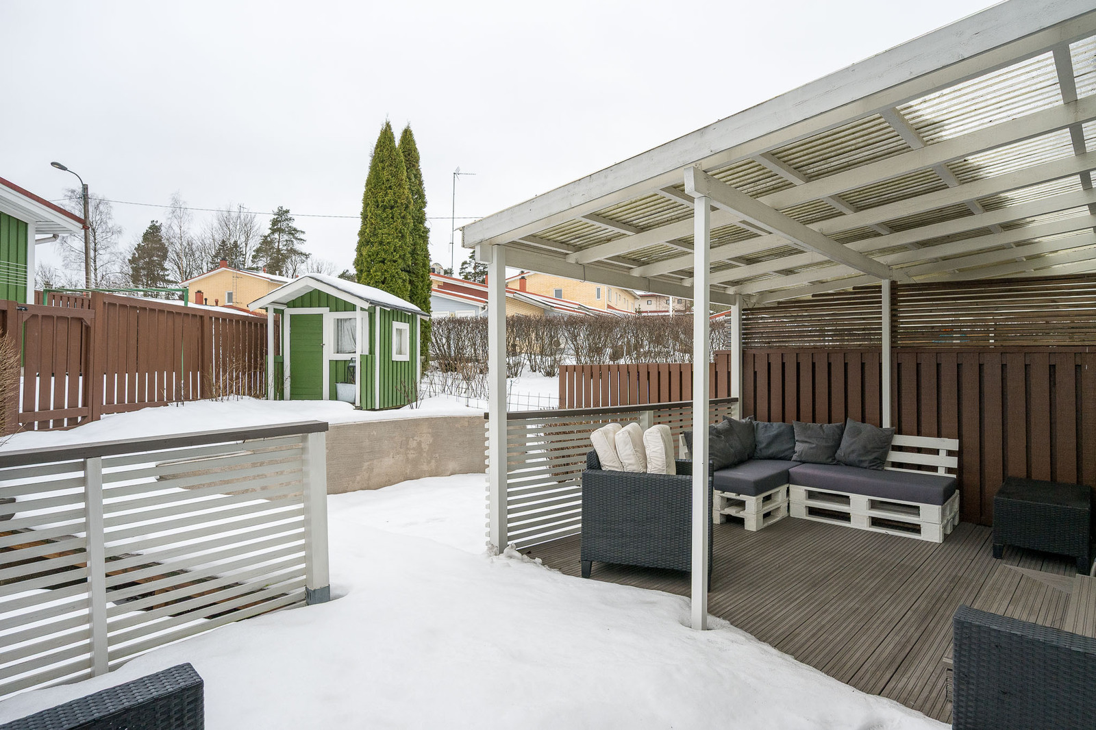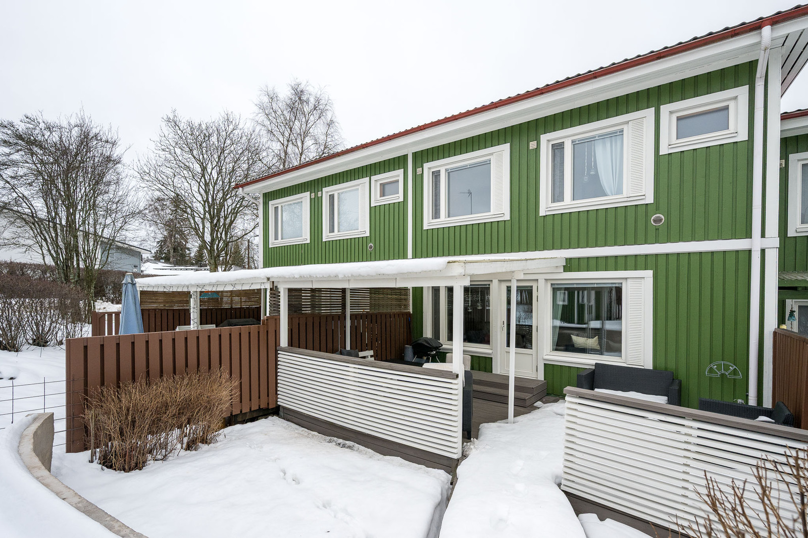 ESITTELY SUNNUNTAINA 12.4. KELLO 15:45-16:30. TERVETULOA! Tilava ja lämminhenkinen koti Rajakylän rauhassa Tässä kodissa yhdistyvät tilavuus, valo ja rauhallinen ympäristö tavalla, joka tekee arjesta mutkatonta ja viihtyisää. Kahteen kerrokseen rakentuva rivitaloasunto tarjoaa selkeät, toimivat tilat ja kodikkaan tunnelman, joka mukautuu elämäntilanteiden mukana. Vuosien varrella tehdyt päivitykset tuovat kokonaisuuteen huolitellun ilmeen. Lämmitys hoituu kaukolämmöllä vesikiertoisten pattereiden kautta ja kustannukset sisältyvät hoitovastikkeeseen. Valoisa alakerta, joka kutsuu viihtymään Olohuone tulvii luonnonvaloa ja avautuu suoraan aurinkoiselle takapihalle. Katettu terassi jatkuu omalle pihalle, jossa on tilaa leikeille, oleskelulle ja kesäpäivien viettoon. Pihan leikkimökki hurmaa perheen pienimmät ja tekee pihasta viihtyisän. Keittiöön mahtuu reilu ruokailuryhmä ja alakerran erillinen wc tekee arjesta sujuvaa. Yläkerran rauha ja oma sauna Yläkerrassa sijaitsevat makuuhuoneet tarjoavat oman rauhallisen kerroksensa. Pesuhuoneen yhteydessä oleva sauna on hiljattain uudistettu lauteineen ja panelointeineen. Kerrosten selkeä jako tekee kodista toimivan niin perheelle, etätyöhön kuin harrastuksille. Sijainti, joka tekee arjesta helppoa Rajakylässä kaikki tärkeä on lähellä. Pizzeria on keihäänheiton päässä (130 m), päiväkoti, koulu, sekä neuvola löytyvät kävelyetäisyydeltä (1,4 km). Lähimmät kaupat sijaitsevat Länsimäessä (1,6 km), Jakomäessä (1,4 km) ja Kontulassa (1,4 km). Länsimäen terveysasemalle on matkaa noin 1,7 kilometriä. Bussipysäkki on aivan vieressä, ja Helsingin rajan pysäkillekin on vain noin 350 metriä. Autolla liikut nopeasti Kehä III:lle sekä Lahden- ja Porvoonväylille. Ulkoilusta nauttivalle sijainti on erinomainen: lenkkipolut alkavat lähes takapihalta ja vieressä sijaitseva pallopuisto tarjoaa leikki- ja kuntoilualueen sekä tenniskentät. Lisätiedot Tuire 050 3434 604 tai tuire@kotimeklarit.com