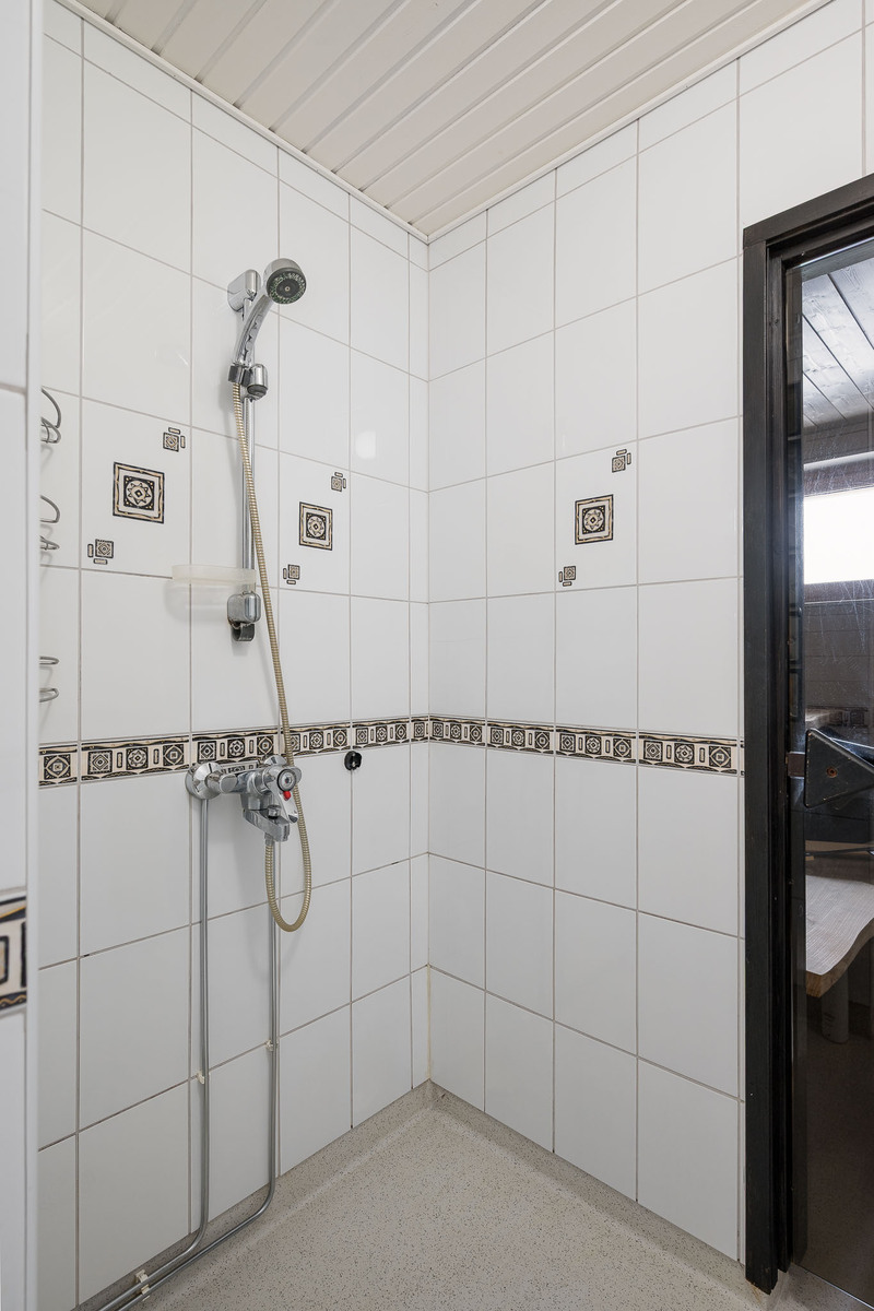 Yläkerran kylpyhuone on tilava. Suihkutilan seinät laatoitettu ja kuivatilan seinät betonipinnoitettu ja maalattu. Lattiassa muovimatto. Varusteet:Peili, valaisin, allaskaappi, wc-istuin ja suihku, |