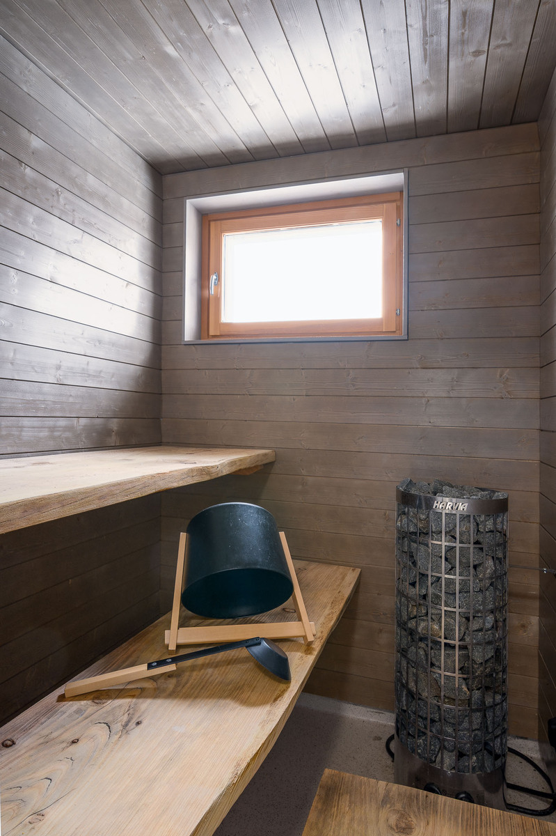 Oma saunaKiva tummasävyinen hilattain remontoitu sauna, jossa ikkuna. Saunassa harmaat seinäpaneelit ja lehtikuusilankkulauteet. Lisäksi lasiovi ja Harvian pilari sähkökiuas. Kiukaan tyyppi: sähkökiuas |