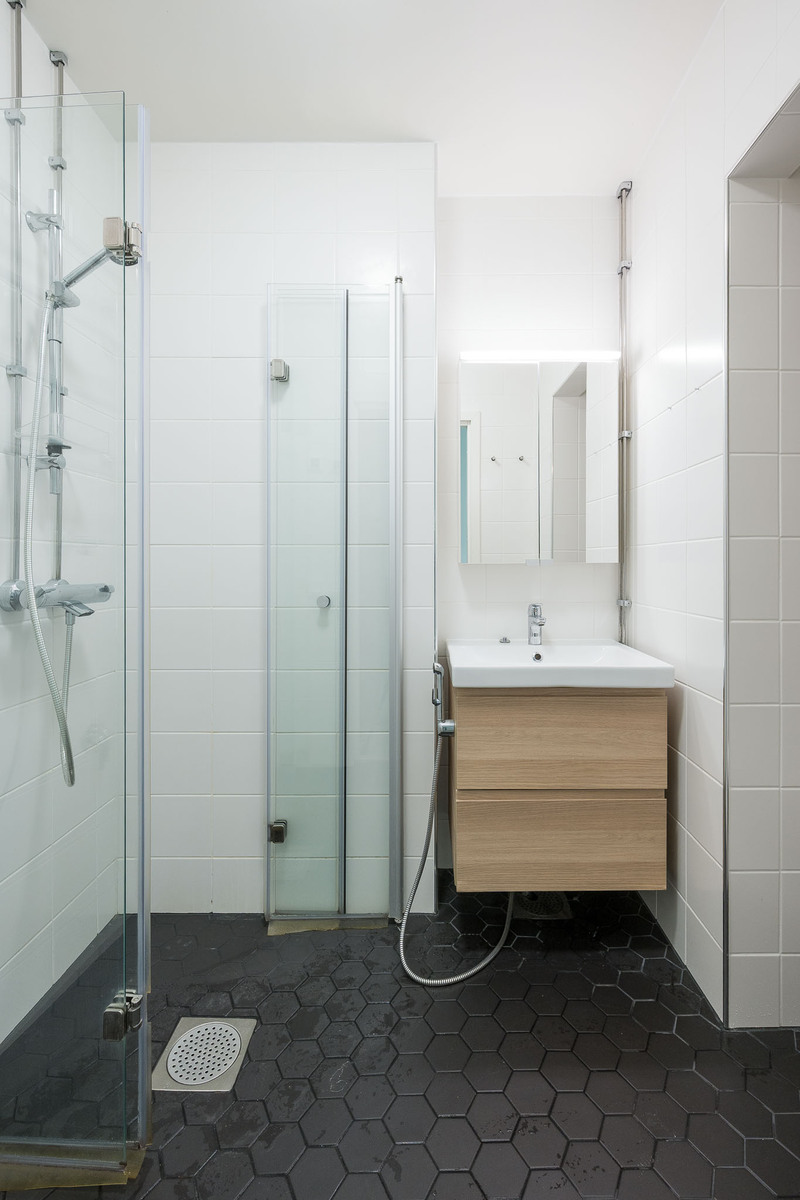 Kylpyhuoneessa wc-istuin, allaskaapisto, peilikaappi, bidee-suihku, suihkuseinät, pesukoneliitäntä sekä pyyhekuivain. Lattia laatoitettu, seinät kaakelia. |