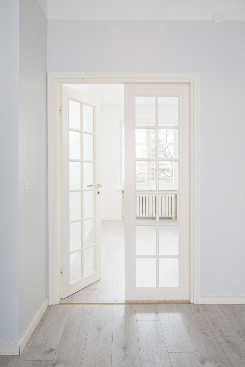 Koko huoneistossa on kaunis vaalea lattia, seinät on maalattu. Olohuoneesta näkymä Mannerheimintielle. |