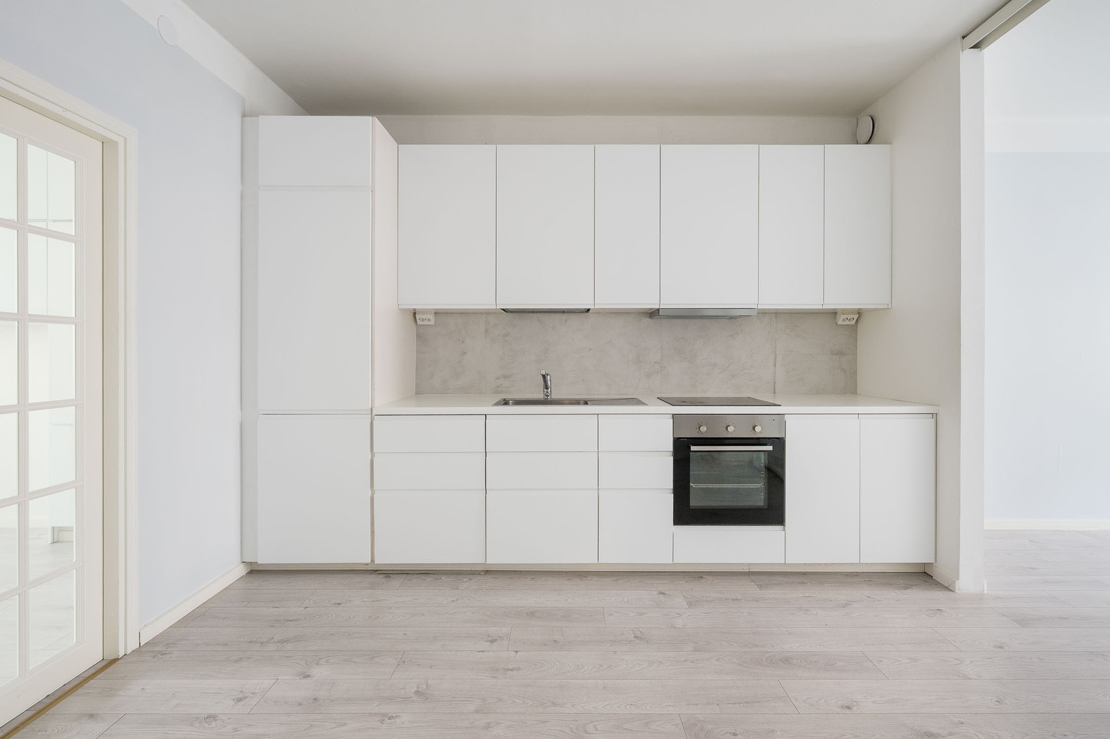 Huoneiden väliin sijoitettu keittiö erottuu olohuoneesta upealla lasiseinällä. Keittiön yhteydessä tilaa ruokapöydälle. Keittiössä on valkoiset vetimettömät kaapistot ja integroidut kodinkoneet. Jääkaappi/pakastin, astianpesukone, uuni, keraaminen liesi. |