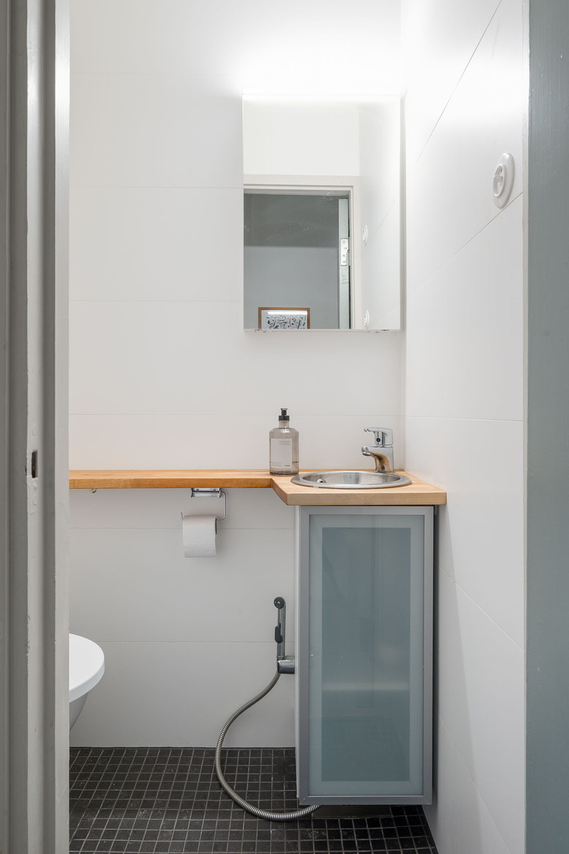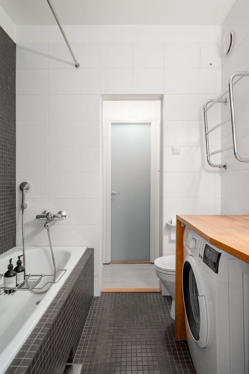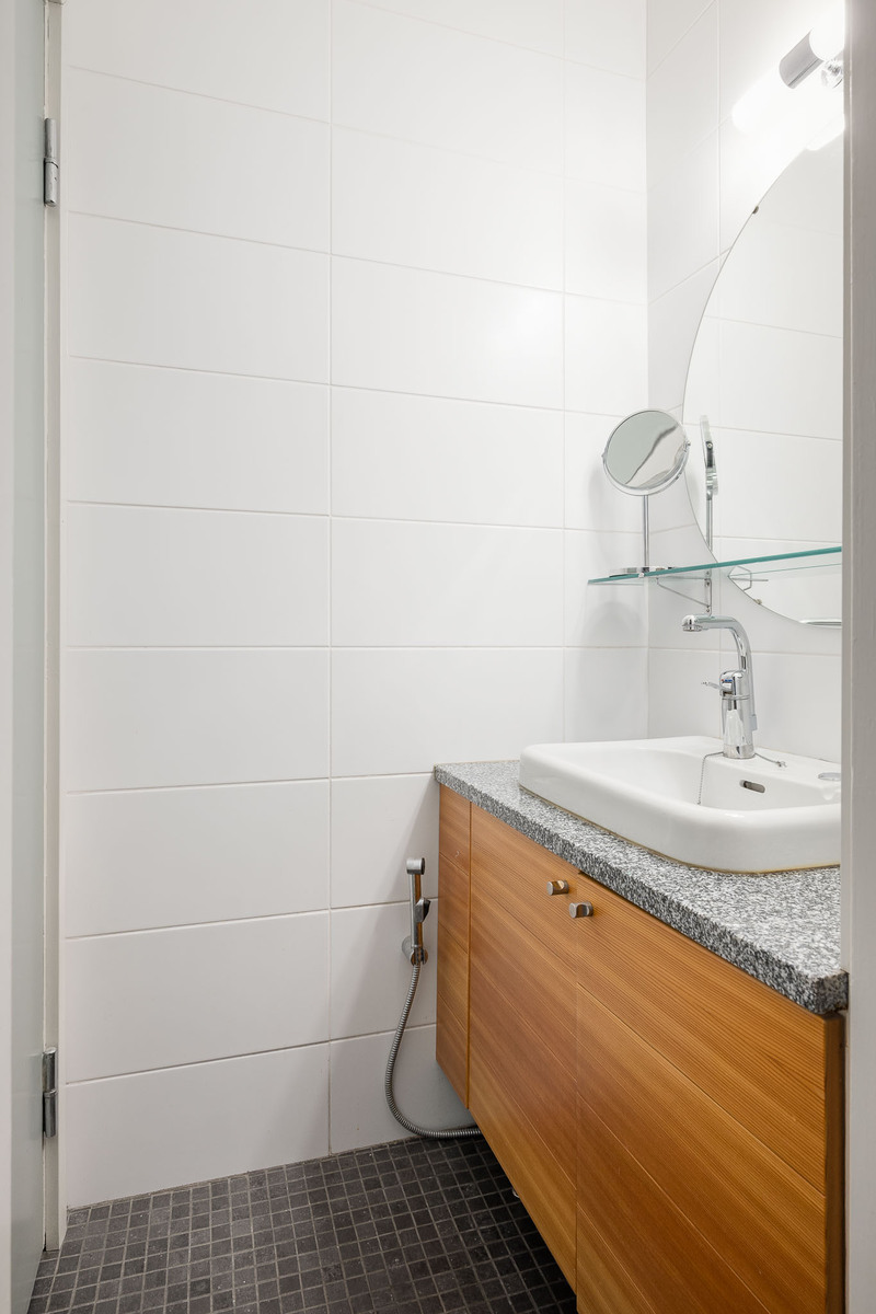 Kylpyhuoneessa mosaiikkilaatta, seinät kaakeloitu. Kylpyhuoneessa amme, wc-istuin, allaskaapisto, peili, rättipatteri, pesukoneliitäntä. |