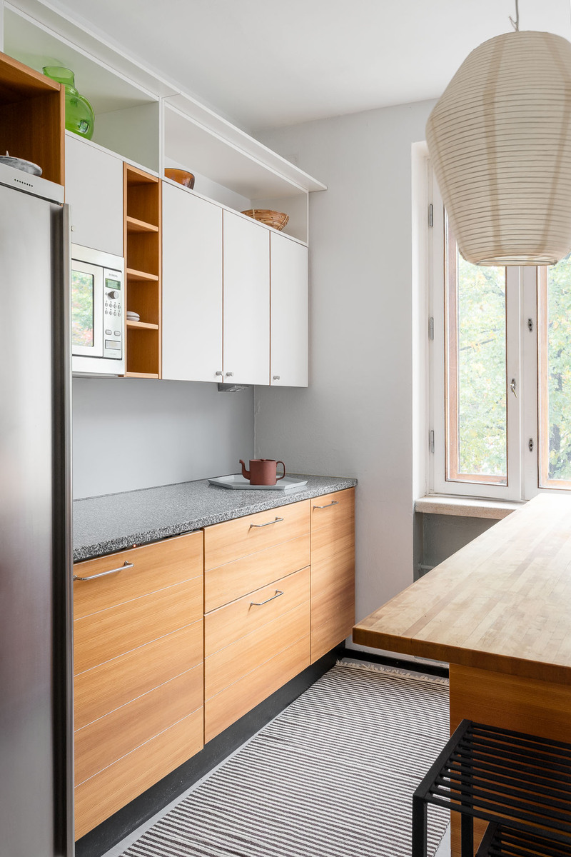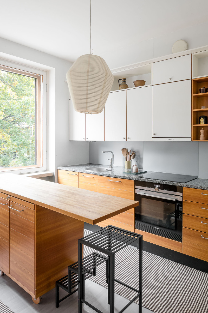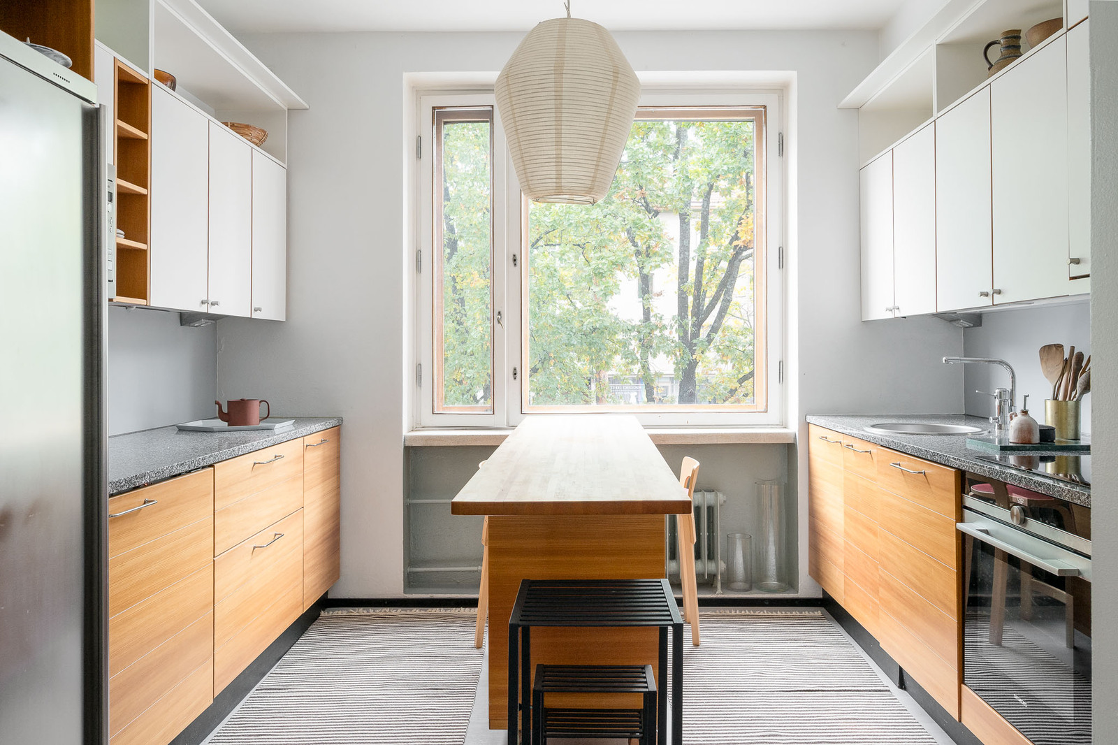 Erillinen keittiö, jossa vaaleat yläkaapit ja puupintaiset alakaapit. Keittiössä kivitasot. Pyörillä oleva liikutettava saareke antaa lisää säilytys- sekä laskutilaa ja toimii myös aamiaispöytänä. Keittiössä Integroitu astianpesukone ja pakastin, induktioliesi, liesituuletin, mikro, uuni ja täyskorkea jääkaappi. |