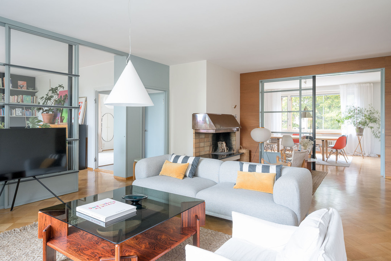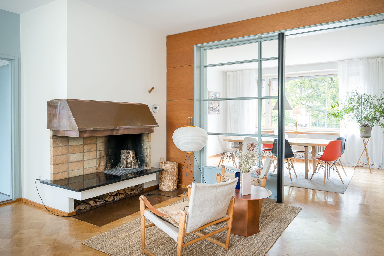 Valoisa ja avara olohuone, joka yhdistyy ruokailutilaan sekä makuu-/työhuoneeseen. Olohuoneessa kaunis toimiva takka ja kulku parvekkeelle. Olohuoneessa alkuperäinen massiivipuuparketti. |