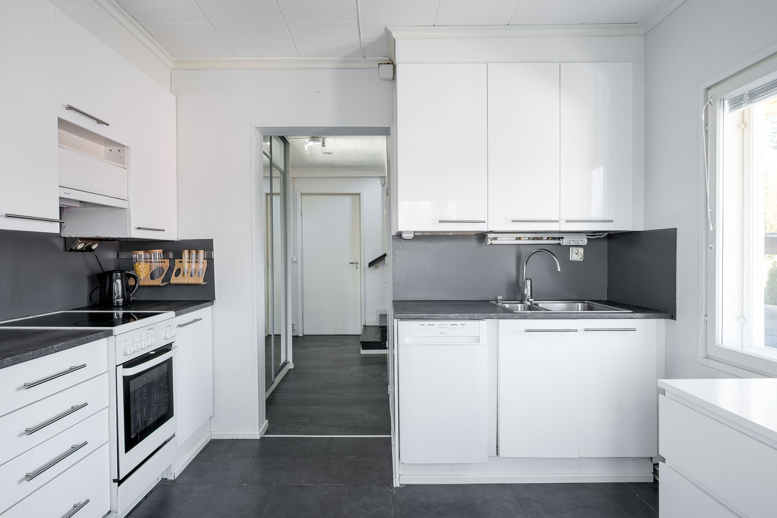 Varustus: jääkaappi,pakastin Liesi: sähköliesi Työtasot: laminaatti Lattia: laatta Seinät: maalattu |