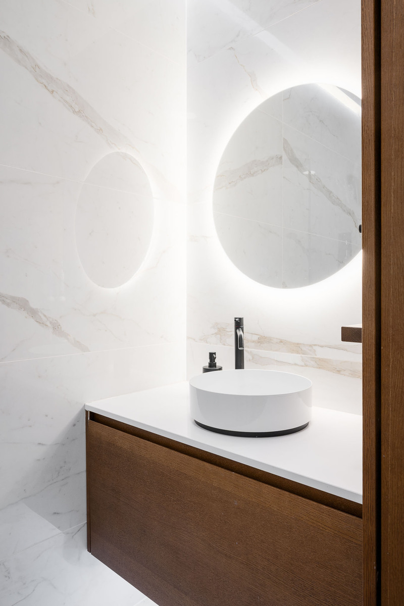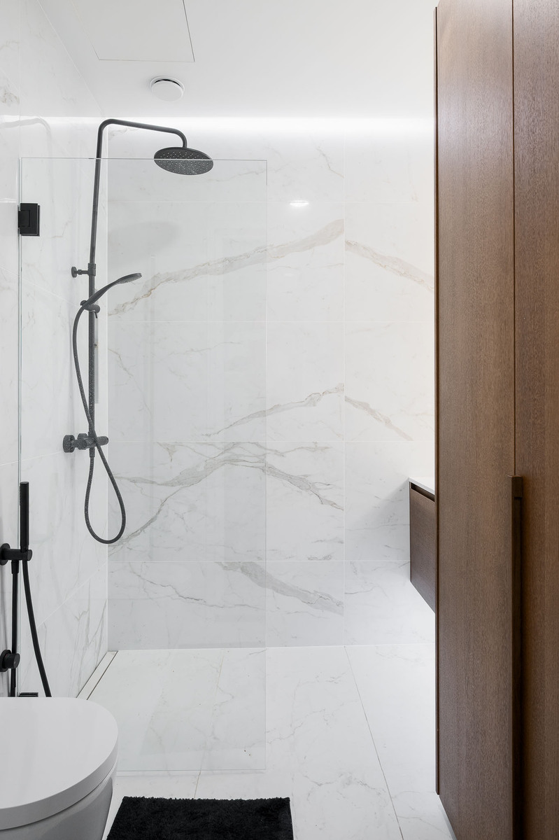 Huoneiston pienemmässä kylpyhuoneessa on suuri Atlas Concorden keraaminen lattaa lattiassa ja seinissä. Lattiassa lattialämmitys. Puusepän valmistamat kaapistot, jonka sisällä pesukoneliitäntä. Duravitin wc-istuin, bidee, suihkuseinä ja sadetinsuihku. Suuremmassa kylpyhuoneessa myös suuri keraaminen Atlas Concorden laatta lattiassa sekä seinissä. Duravitin pesevä wc-istuin kosketusvapaalla huuhtelupainikkeella ja yövalolla, suihkuseinä ja sadetinsuihku, peilikaappi. Allaskaappi on puusepän valmistama. Molemmissa kylpyhuoneissa laadukkaat italialaiset Gessin hanat ja suihkut sekä INR pyyhekuivaimet ja suihkuseinät. |
