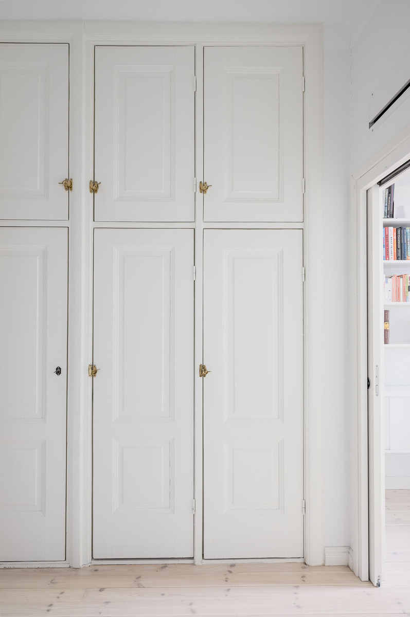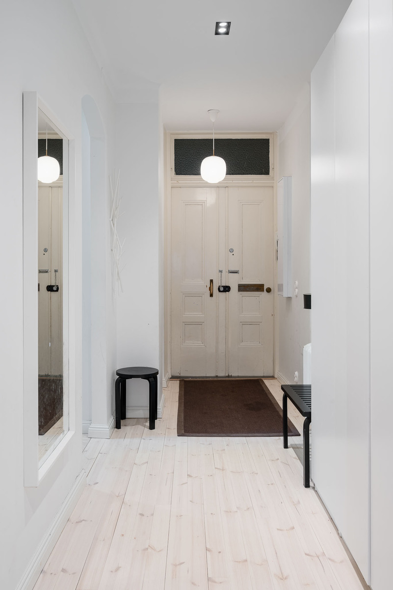 Eteisessä säilytetty alkuperäiset kaapinovet. Lisäksi eteiskäytävältä löytyy reilusti kaappitilaa. |