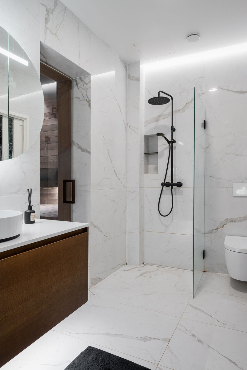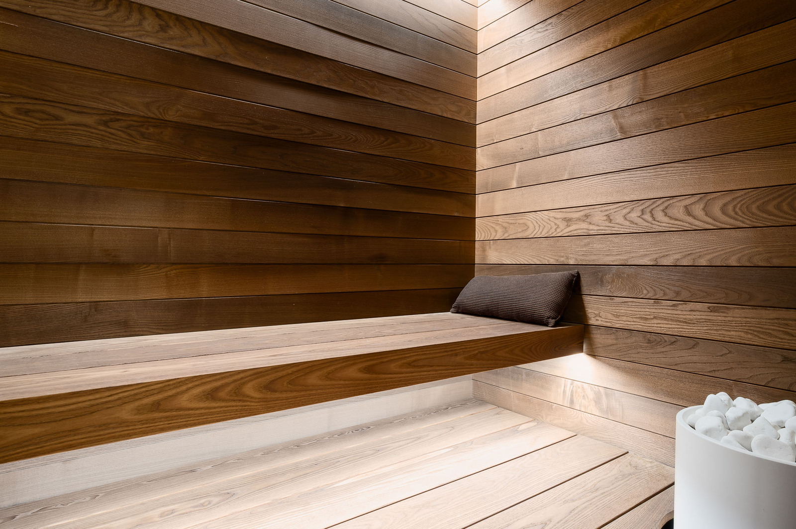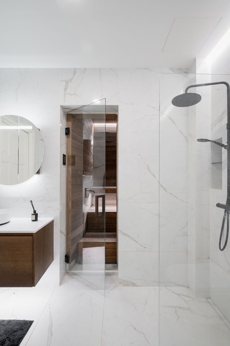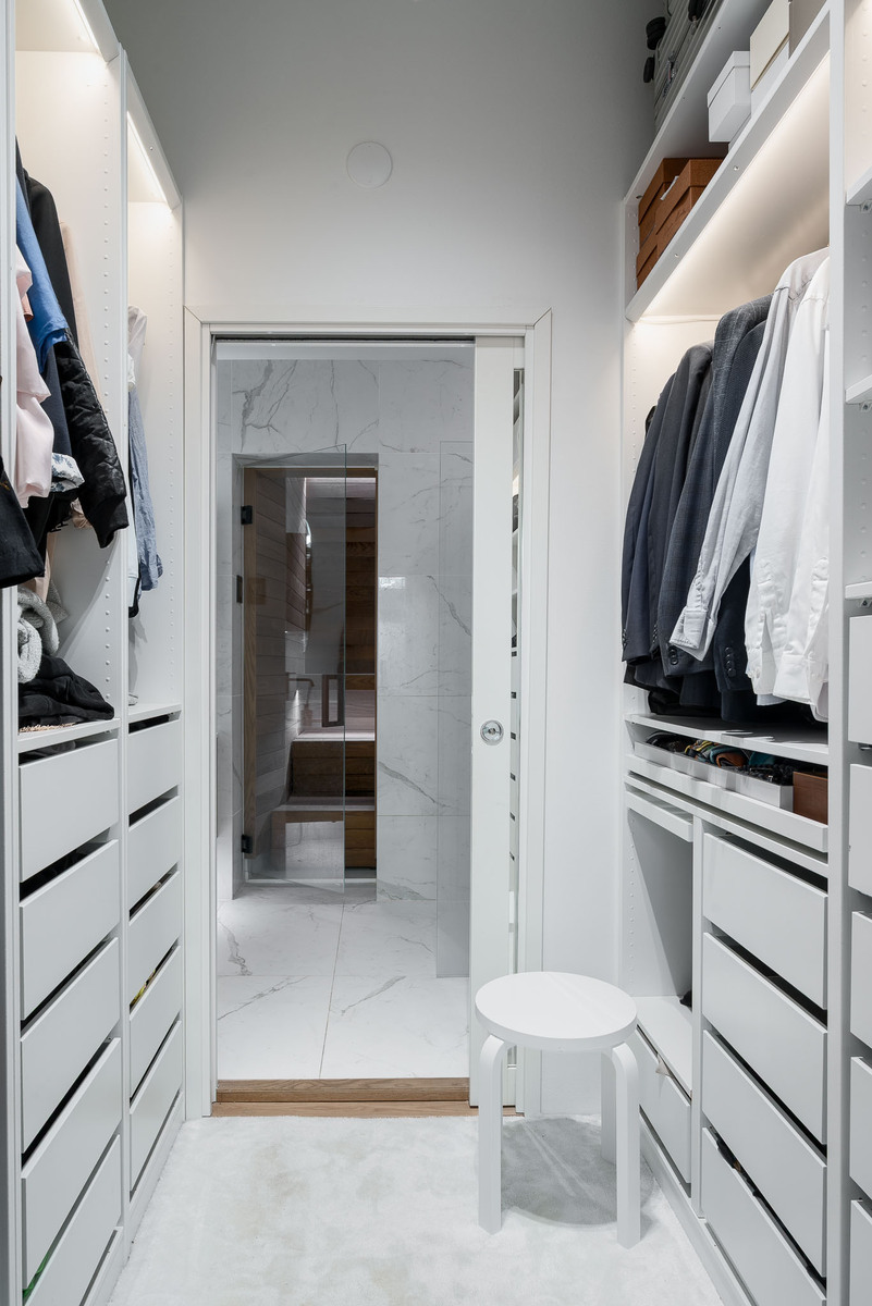 Oma saunaSuuremman kylpyhuoneen yhteydessä tyylikäs sauna, jossa puusepän tekemät lämpösaarni-lauteet ja paneelit sekä Tulikiven Kuura-kiuas. |