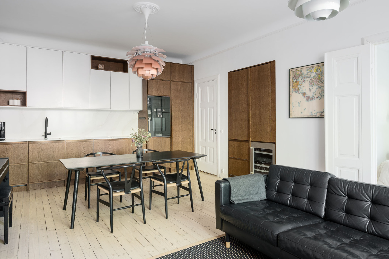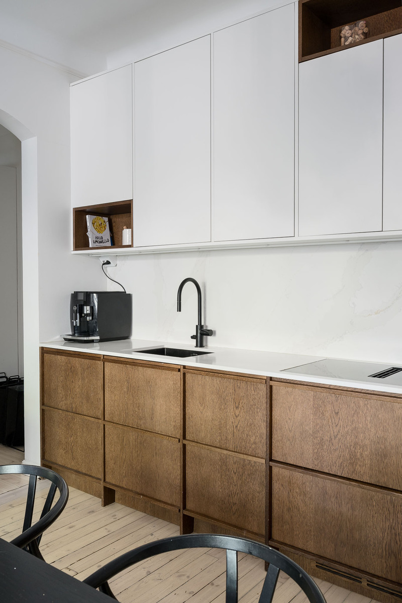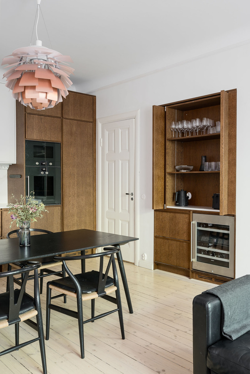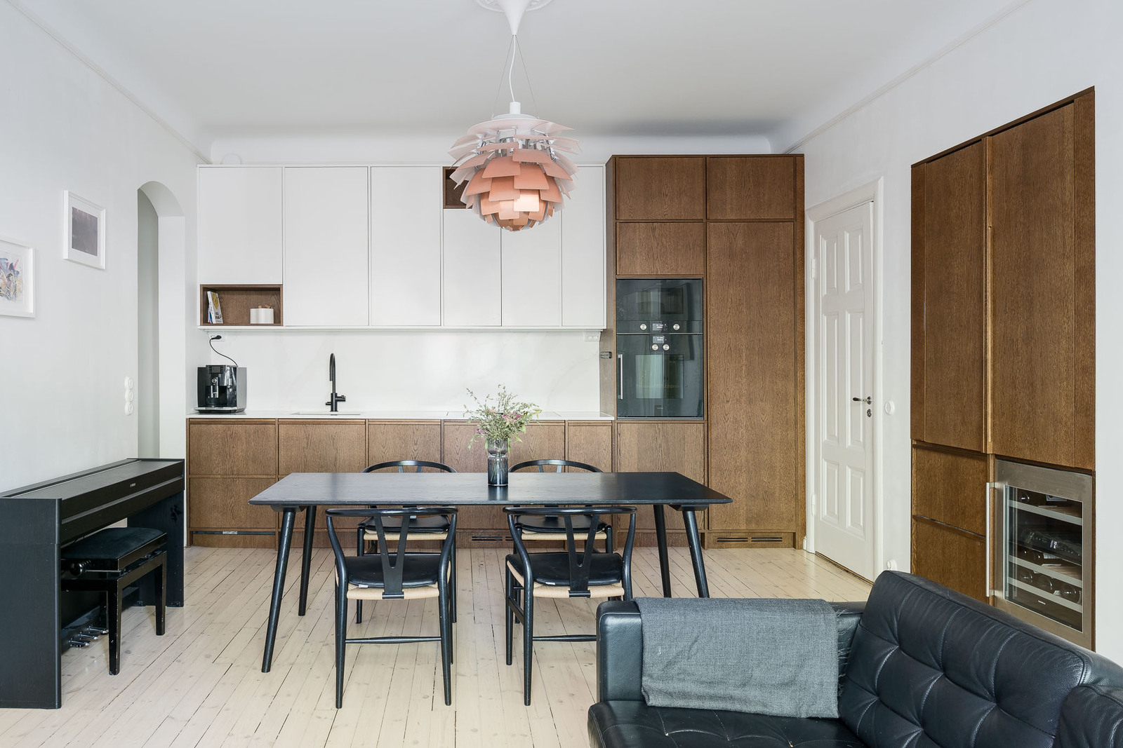Puusepän valmistama Nordiska Kök- keittiö, jossa tammiviilukaapistot ja Silestone kvartsitasot. Laadukkaat Gaggenaun kodinkoneet; induktioliesitaso tuulettimella, kalusteuuni sekä mikro. Integroidut jääkaappi/pakastin ja astianpesukone. Upotetussa aamiaiskaapissa Gaggenaun viinikaappi. Keittiö siirretty olohuoneeseen 2023. |