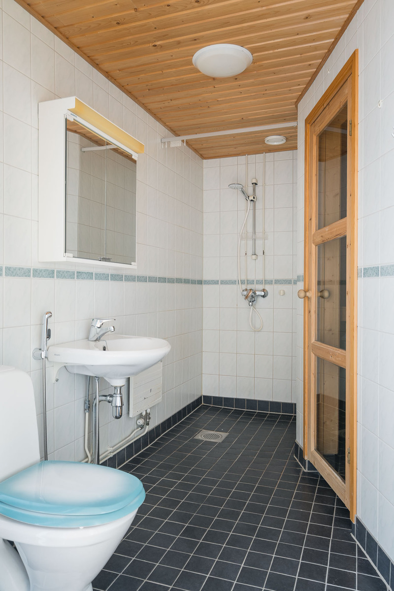 Varustus: suihkuseinä, wc-istuin, suihku, kylpyhuonekaapisto Lattia: laatta Seinät: kaakeli |
