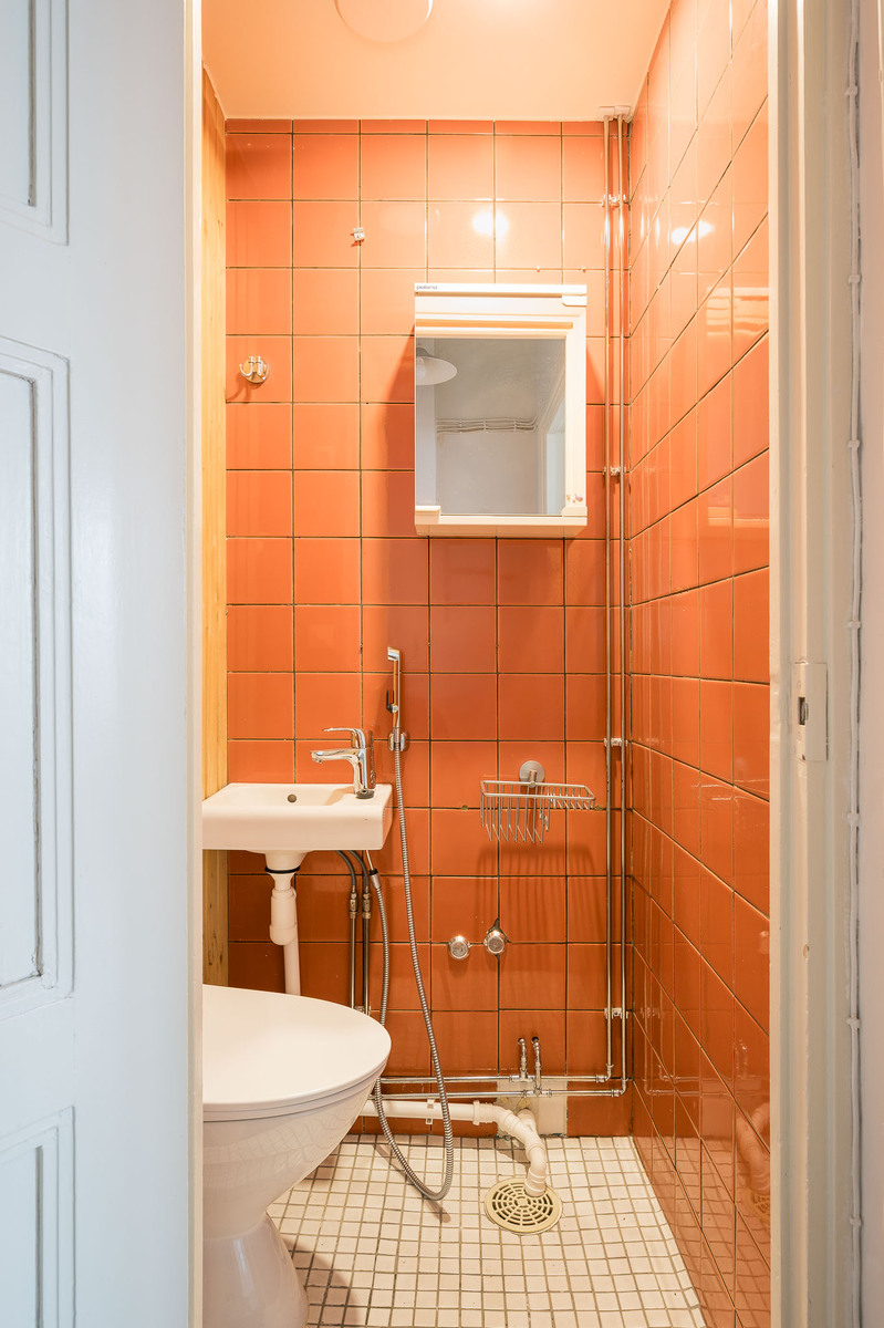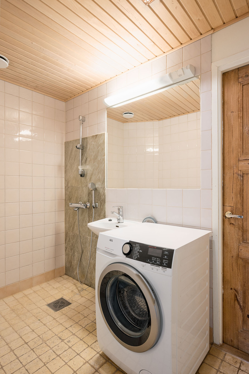 Varustus: pesukone, pesukoneliitäntä, peili Lattia: laatta Seinät: kaakeli |