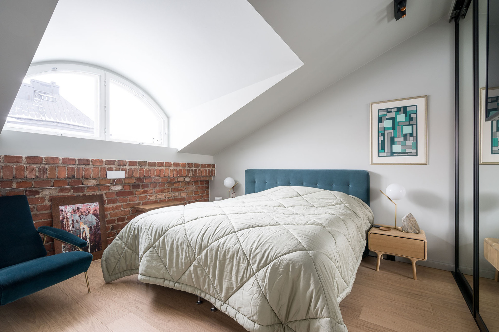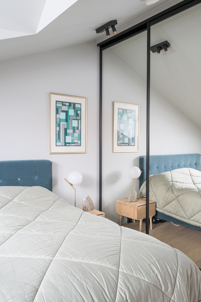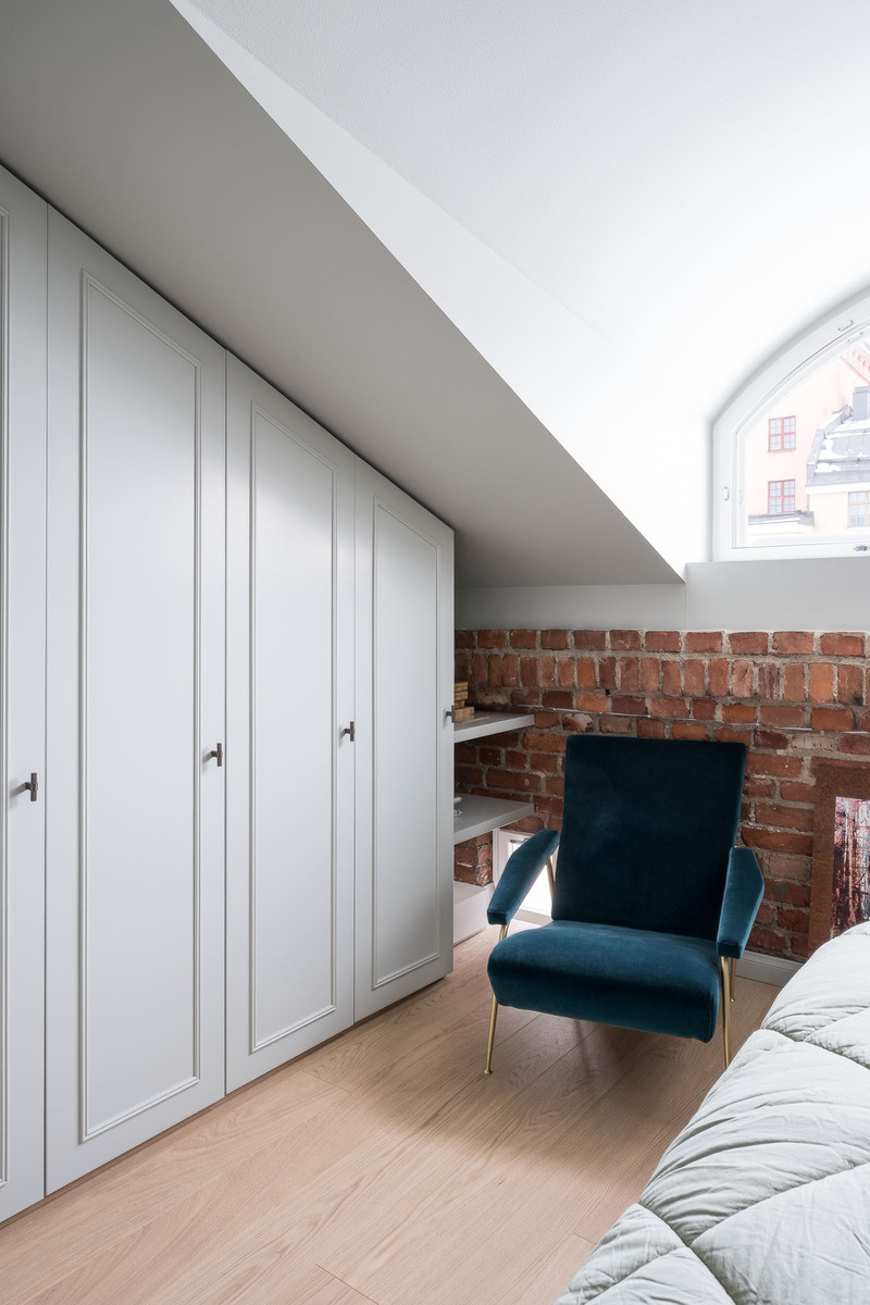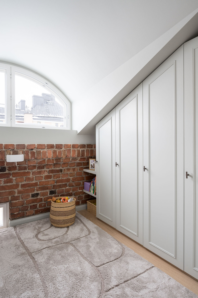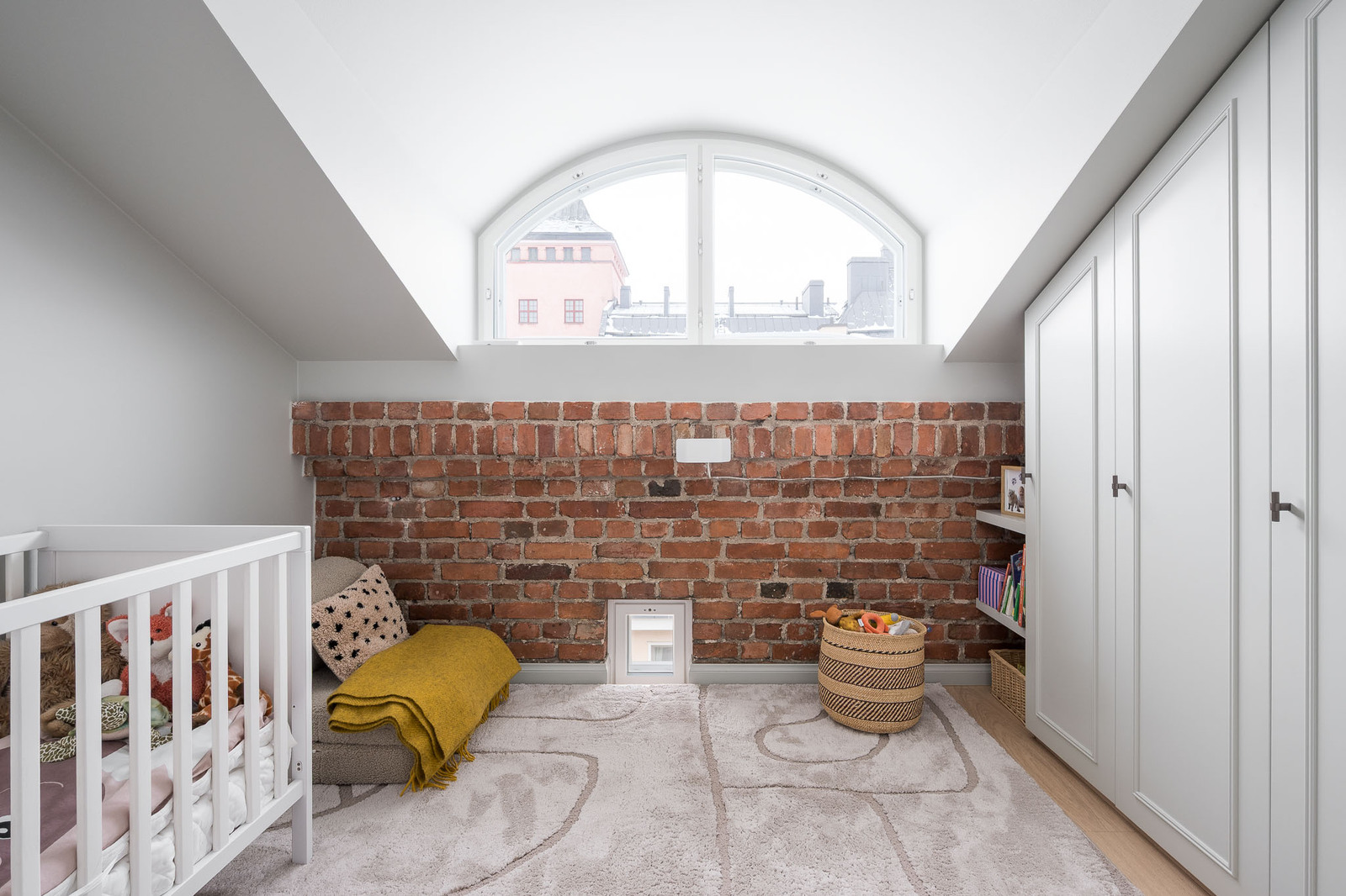 Kaksi makuuhuonetta, joissa molemmissa on kauniit kattolyhdyt kaari-ikkunoin. Ikkunaseinän tiilipinta on kaunis yksityiskohta. Makuuhuoneissa on puusepän valmistamat kaapistot ja ilmalämpöpumput. Päämakuuhuoneessa on lisäksi korkeat liukuovikaapistot ja kulku kylpyhuoneeseen. |