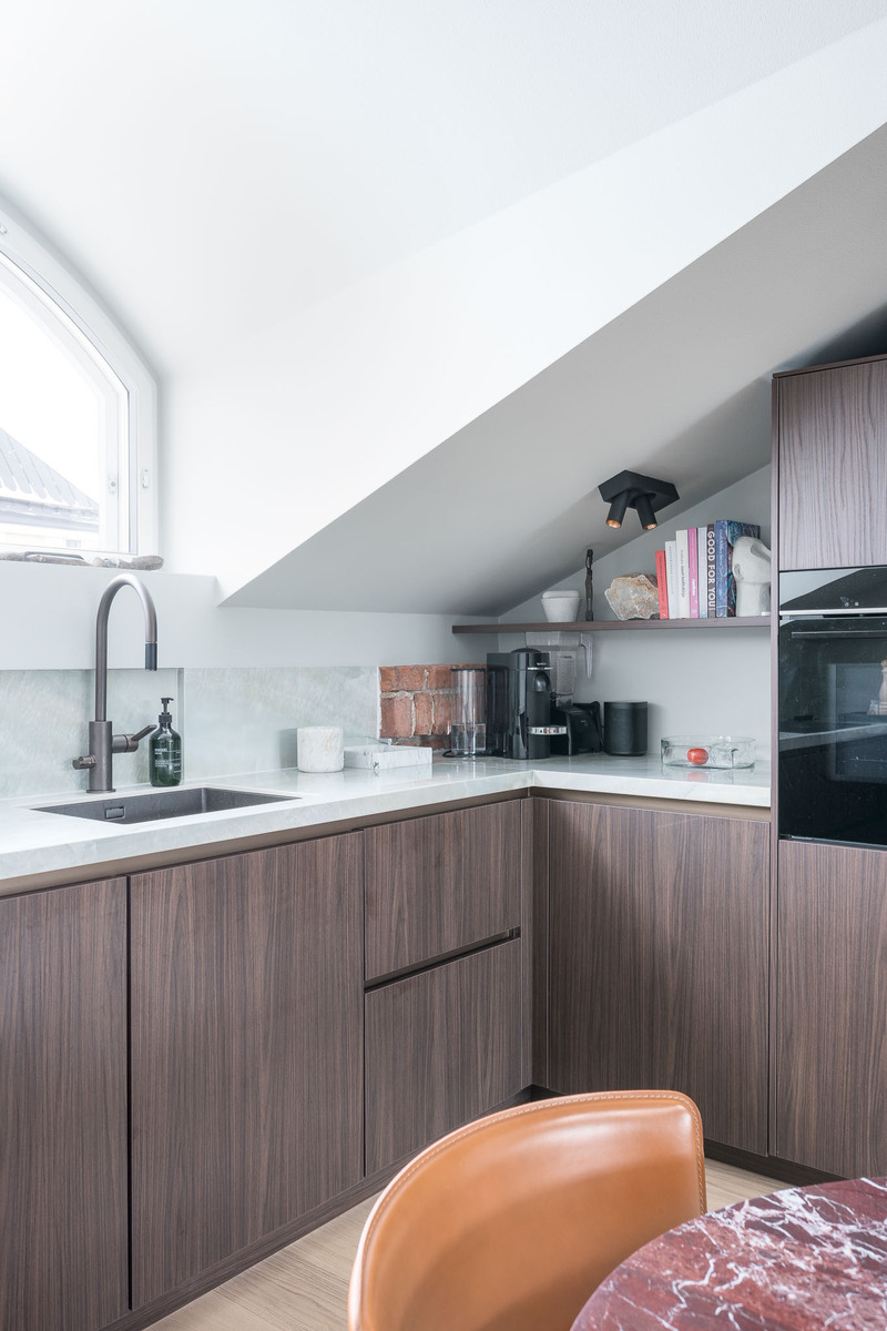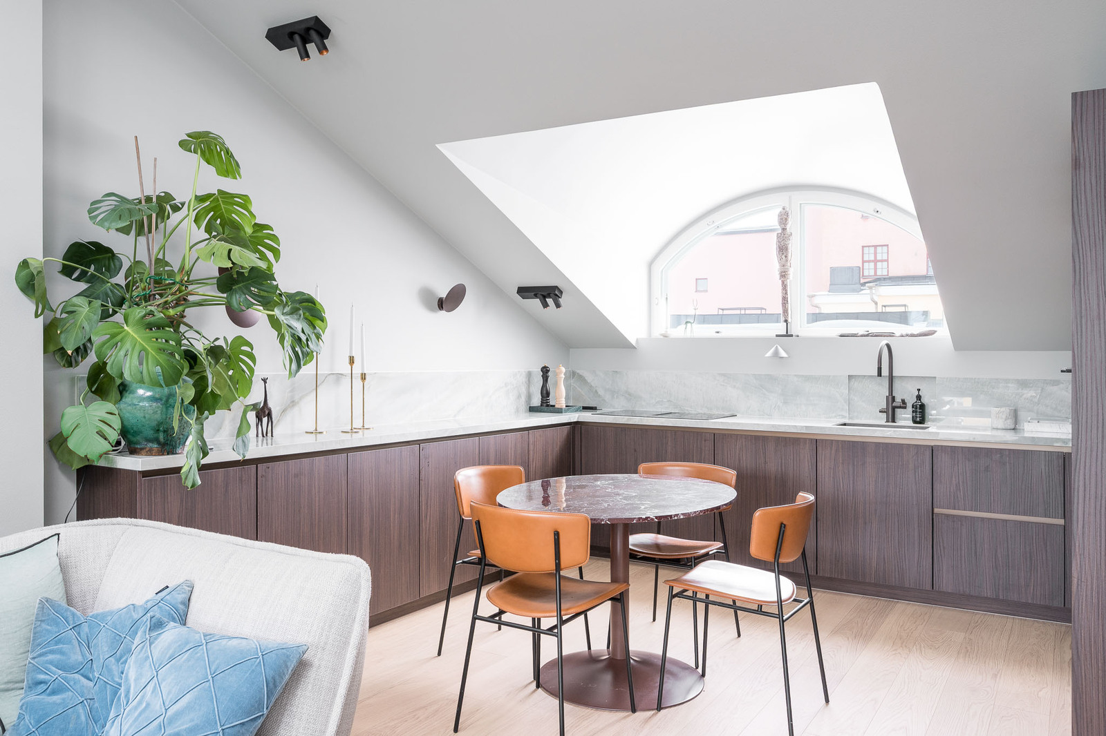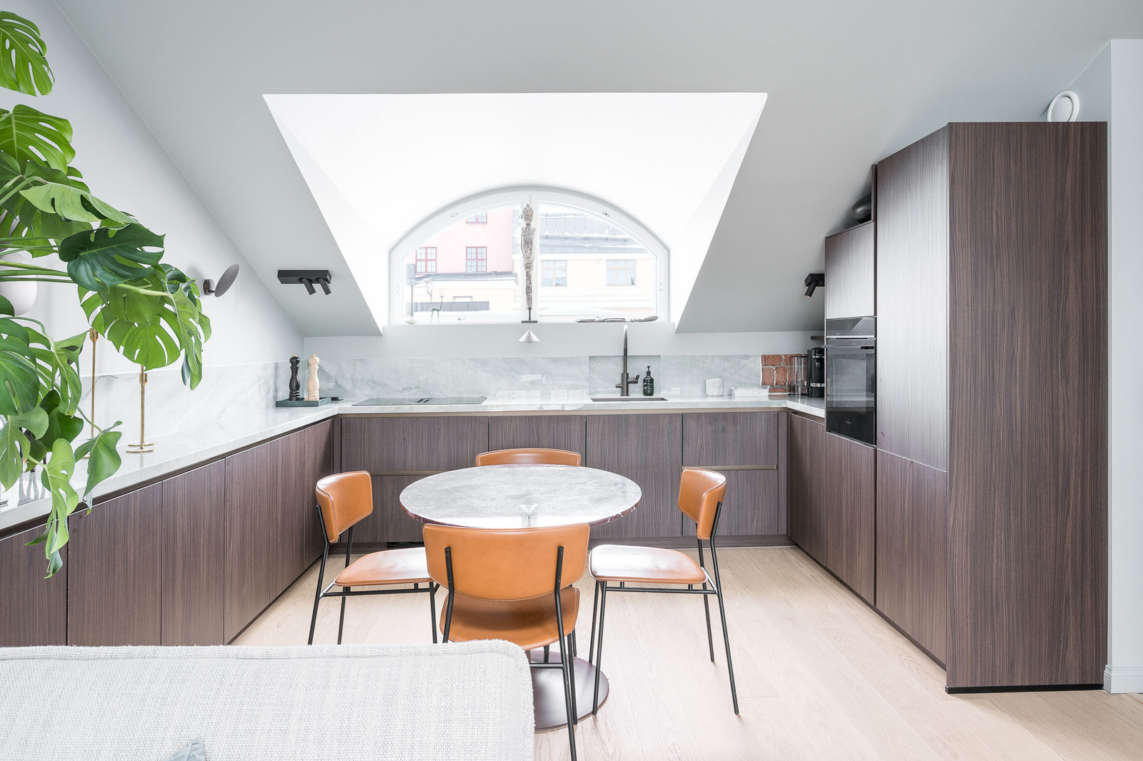 Tyylikäs Noblessan avokeittiö, jossa upea kattolyhty ja kaari-ikkuna kattonäkymin. Keittiössä on integroidut jääkaapi/pakastin ja astianpesukone, induktioliesi upotetulla tuulettimella, kiertoilmauuni. Kaappitilaa on reilusti. Keittiön yhteydessä on tilaa ruokapöydälle. |