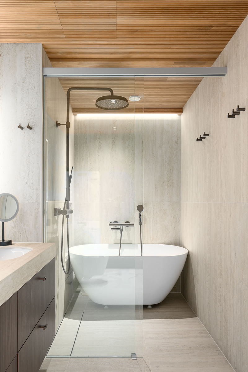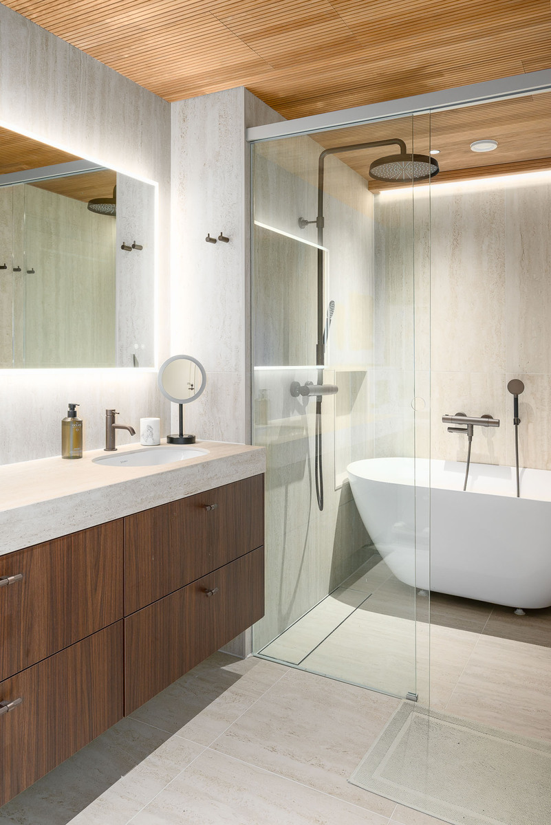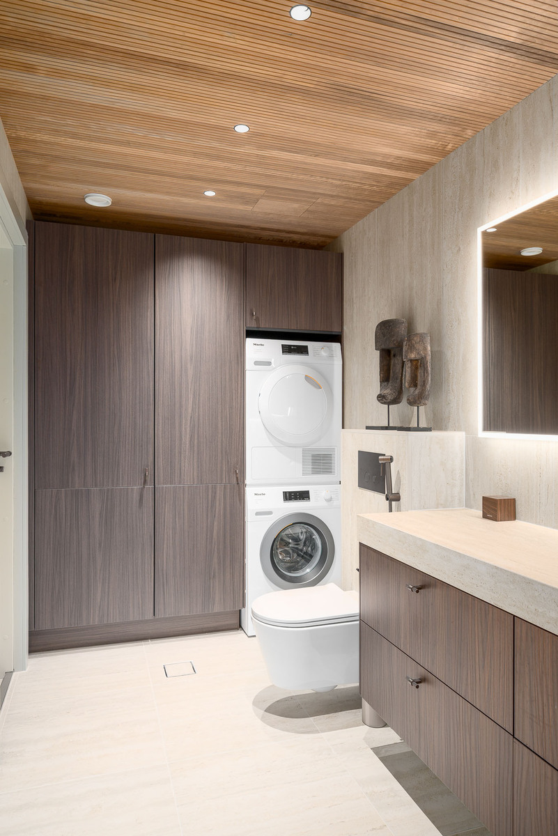Upea kylpyhuone, jossa on kylpyamme, sadesuihku, wc-istuin, bidee-suihku, allaskaapisto, peili ja lattialämmitys. Kylpyhuoneessa on tilavat kaapistot pyykkiihuololle sekä paikka pesutornille. Lattia, seinät ja allastaso ovat samaa travertiinilaattaa. |