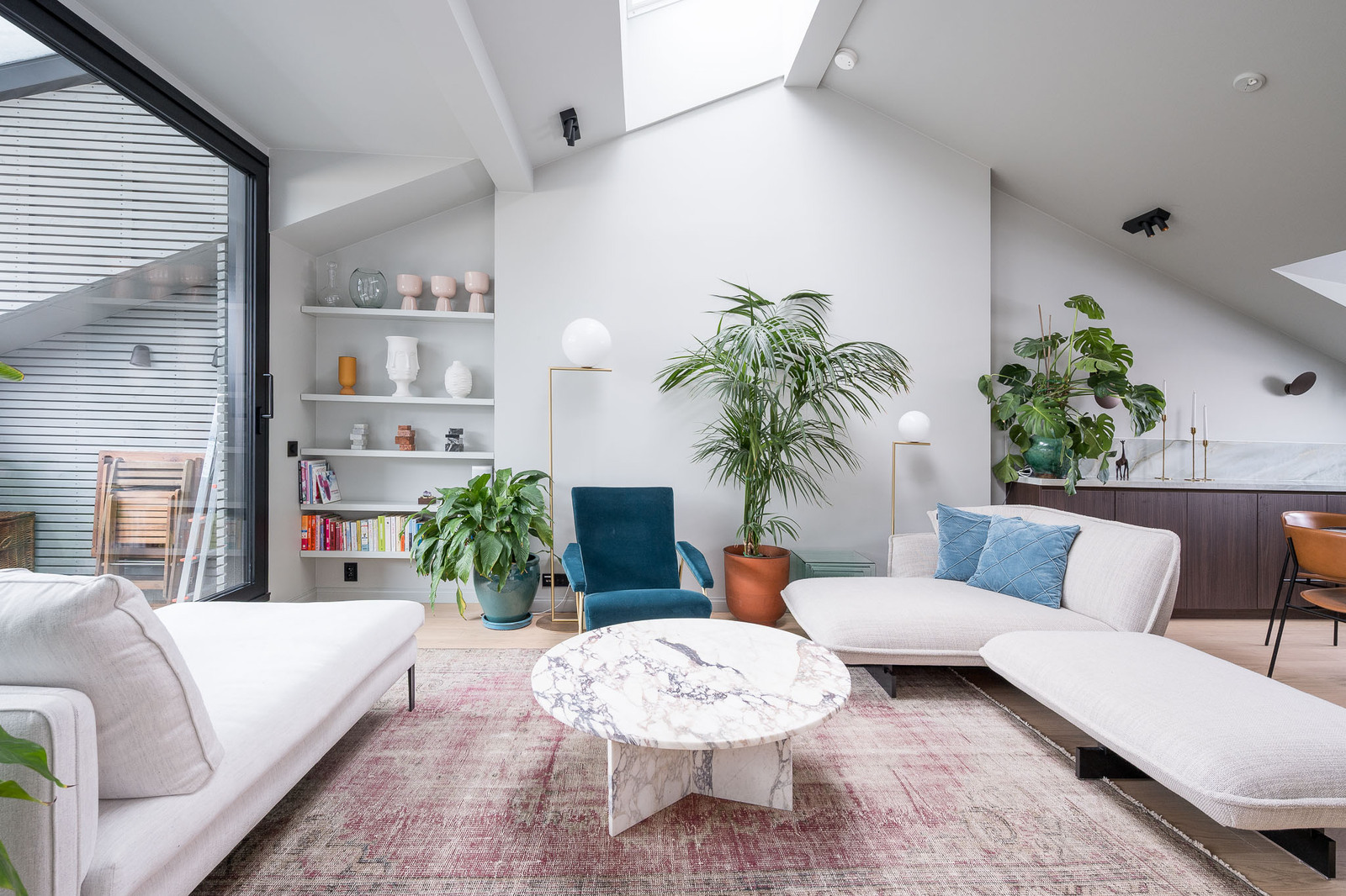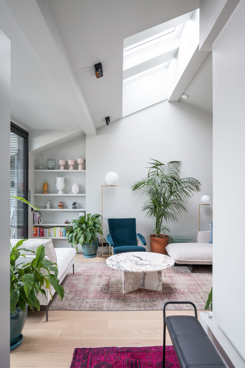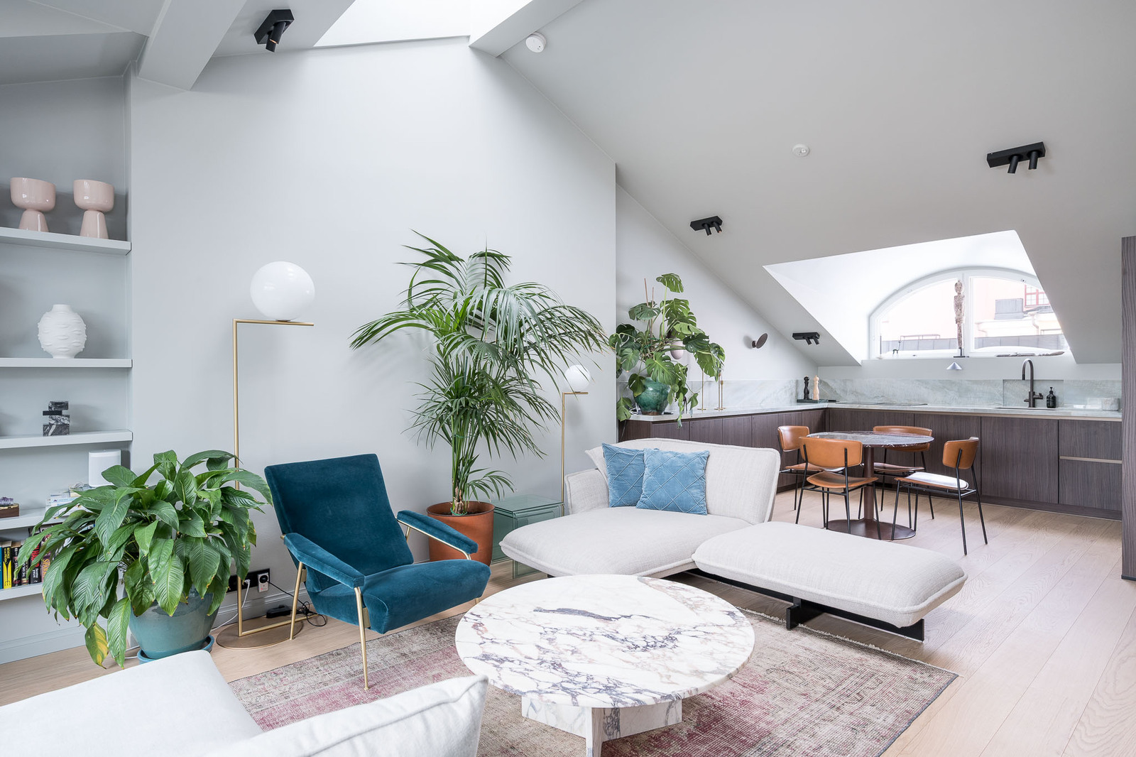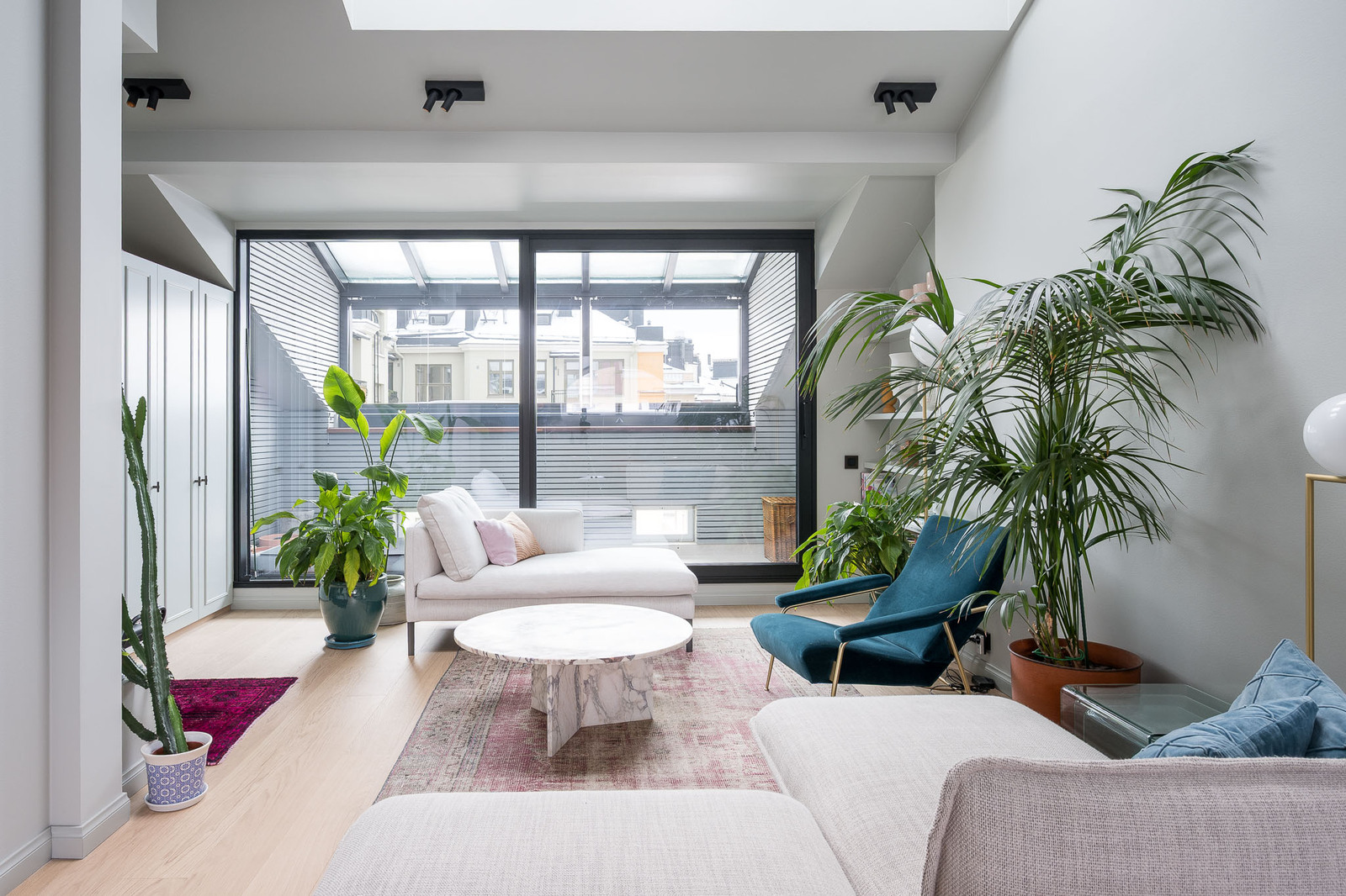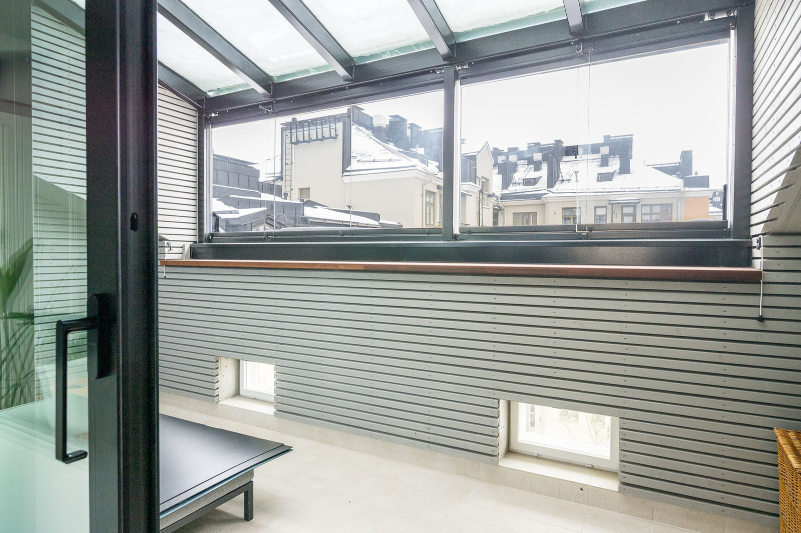 Korkeaan olohuoneeseen valoa tuo kolme kattoikkunaa. Olohuoneen yhteydessä on lasitettu kattoterassi sisäpihan puolelle. Huoneistossa on kaunis tammilankkulattia ja seinät on maalattu kauniin sävyin. Olohuoneessa on ilmalämpöpumppu. |