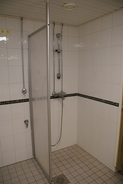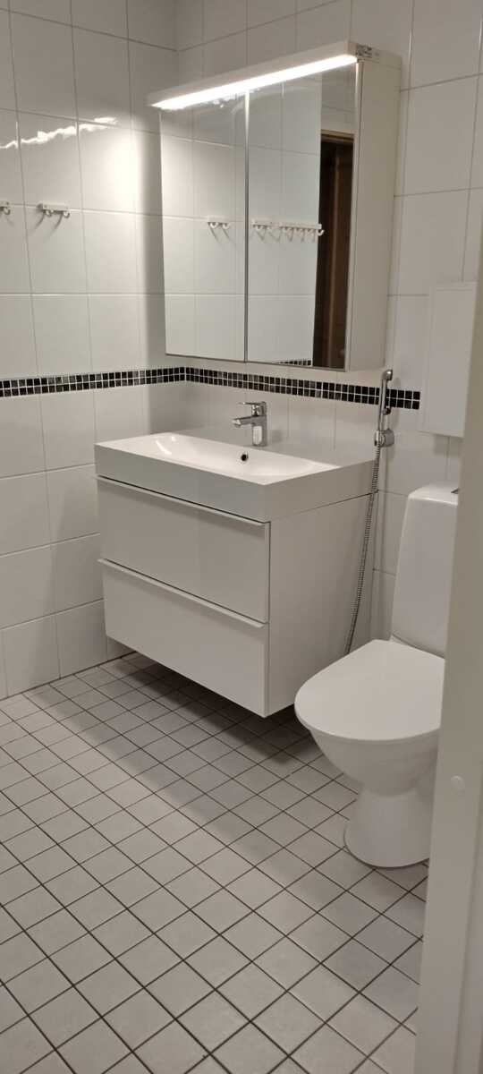 Tilava kylpyhuone, jossa varusteina allaskaappi, peilikaappi, wc-istuin, suihku. Liitäntä pyykkitornille sekä säilytystilaa. |