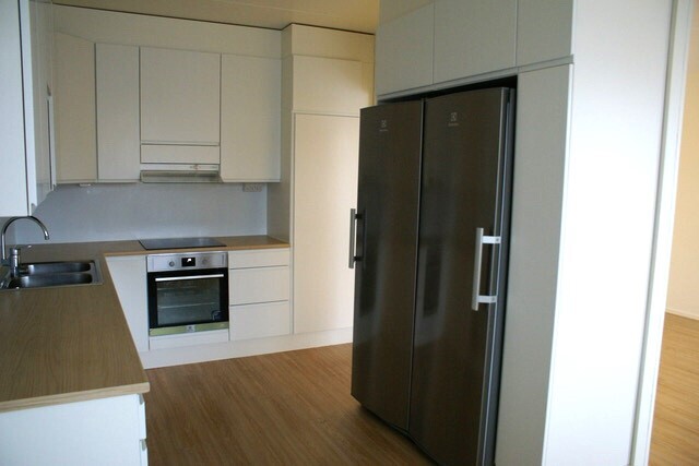 Valkoinen tilava keittiö, varusteina täyskorkeat jääkaappi ja pakastin, keraaminen liesi, erillisuuni, astianpesukone. |