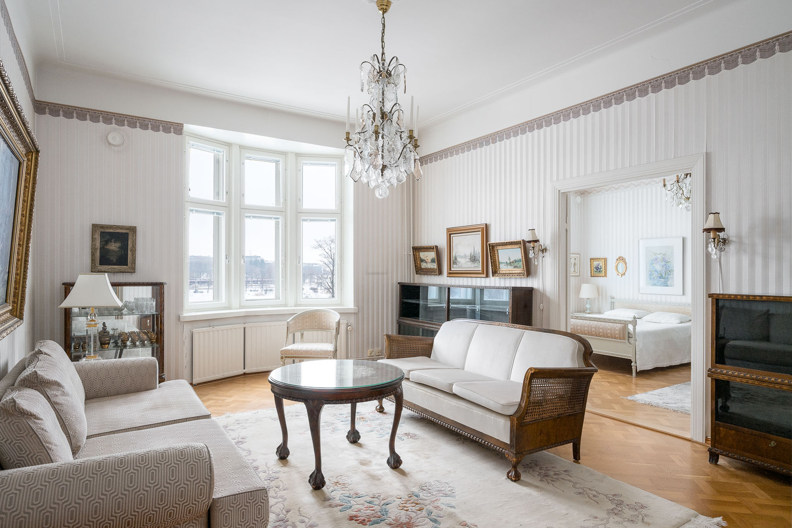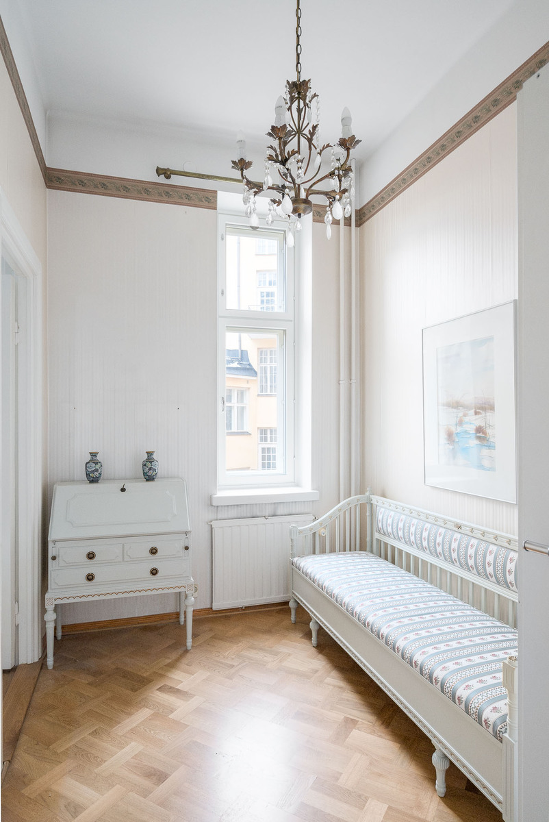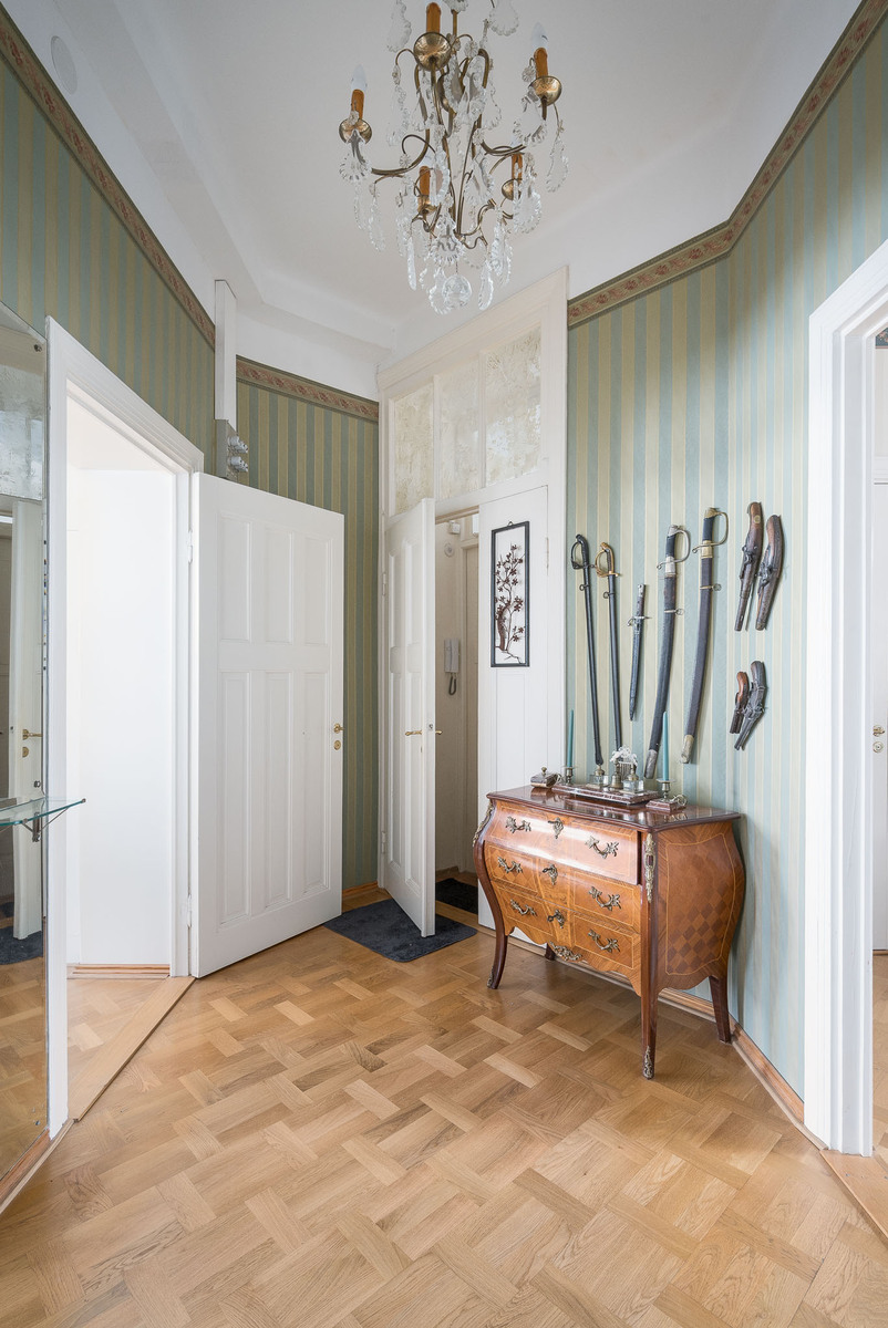 Olohuoneesta aukeaa hulppea ja avoin näkymä Eläintarhanlahdelle. Toinen, ruokasalina toiminut huone sijoittuu sisäpihanpuolelle. Koko huoneistossa on hyväkuntoinen tamminen mosaiikkiparketti ja arvokasta tunnelmaa tuo korkea huonekorkeus sekä tyylikkäät tapetit. |