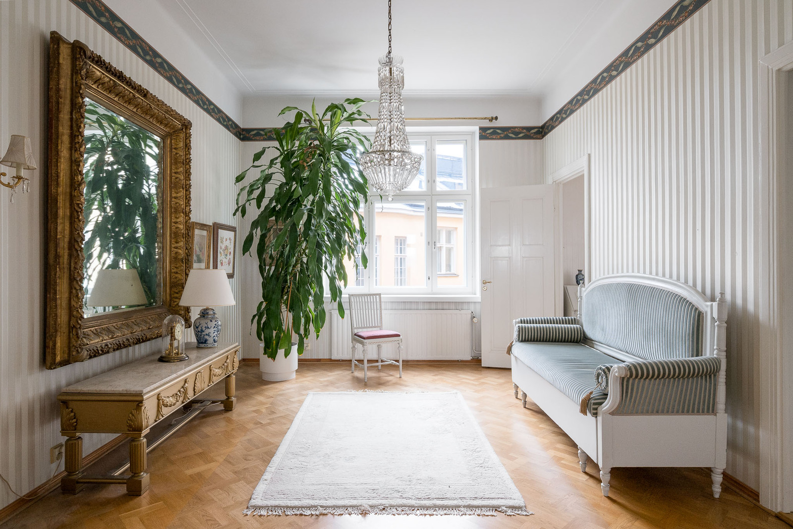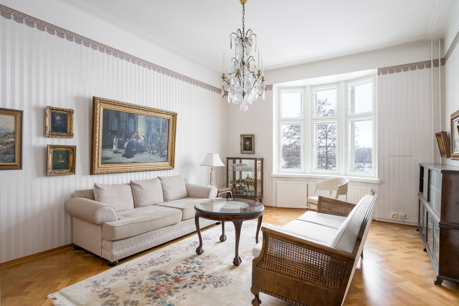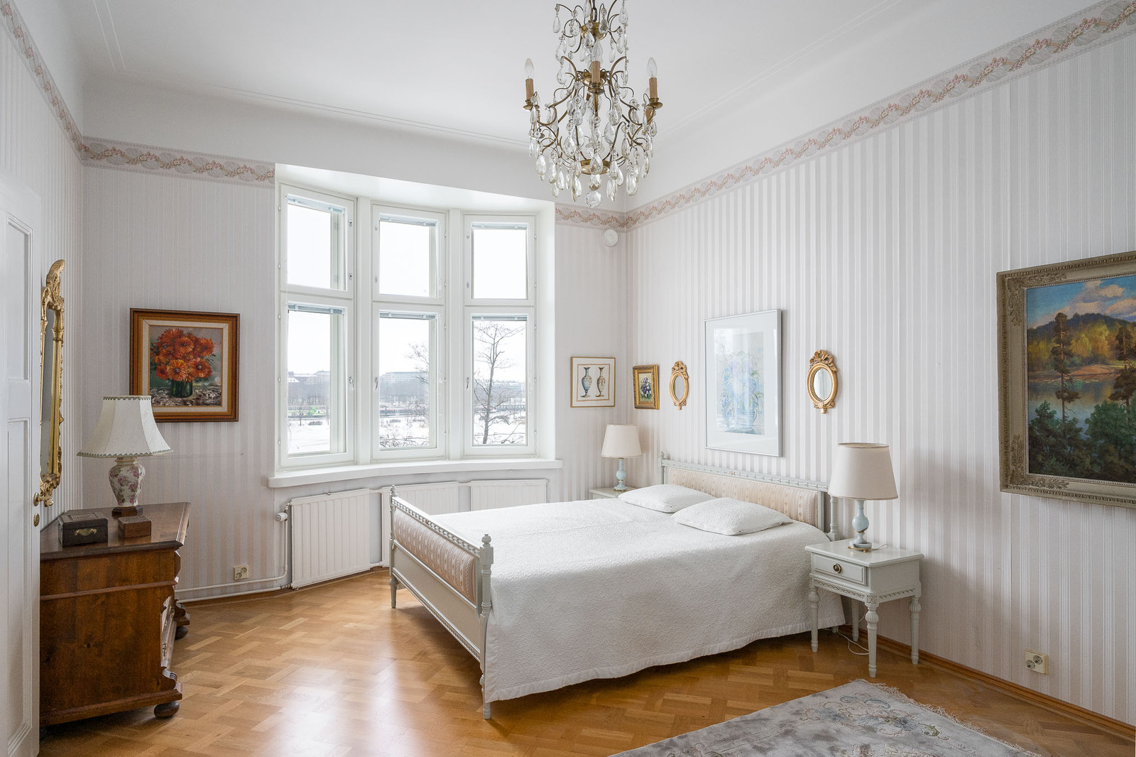 Olohuoneesta aukeaa hulppea ja avoin näkymä Eläintarhanlahdelle. Toinen, ruokasalina toiminut huone sijoittuu sisäpihanpuolelle. Koko huoneistossa on hyväkuntoinen tamminen mosaiikkiparketti ja arvokasta tunnelmaa tuo korkea huonekorkeus sekä tyylikkäät tapetit. |